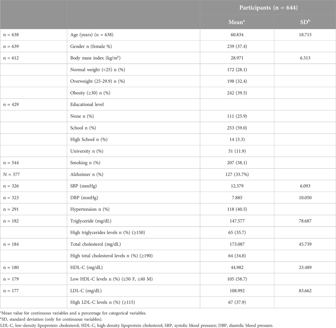 The characteristics of all study participants are described in Table 1. The average age is 61, with 37.4% being females. Of 612 participants, 28.1% had normal weight, 32.4% were overweight, and 242 (39.5%) were obese. Education levels varied also as 25.9% had no formal education, 59.0% attended some school, 3.3% completed high school, and 12.0% attended university. Additionally, 38.1% of the participants were smokers. Blood pressure and lipid measurements were also recorded.