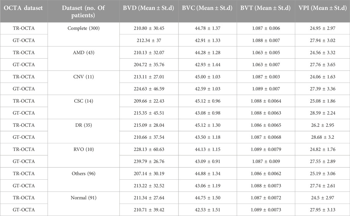 | OCTA dataset | Dataset (no. Of patients) | BVD (Mean ± St.d) | BVC (Mean ± St.d) | BVT (Mean ± St.d) | VPI (Mean ± St.d) |