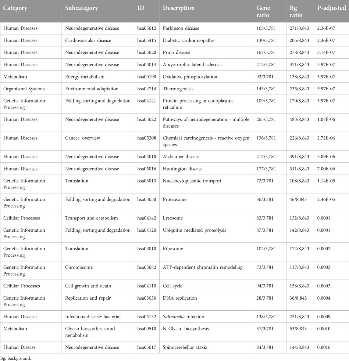 | Human Diseases | Neurodegenerative disease | hsa05014 | Amyotrophic lateral sclerosis | 212/3,781 | 371/8,843 | 5.97E-07 |