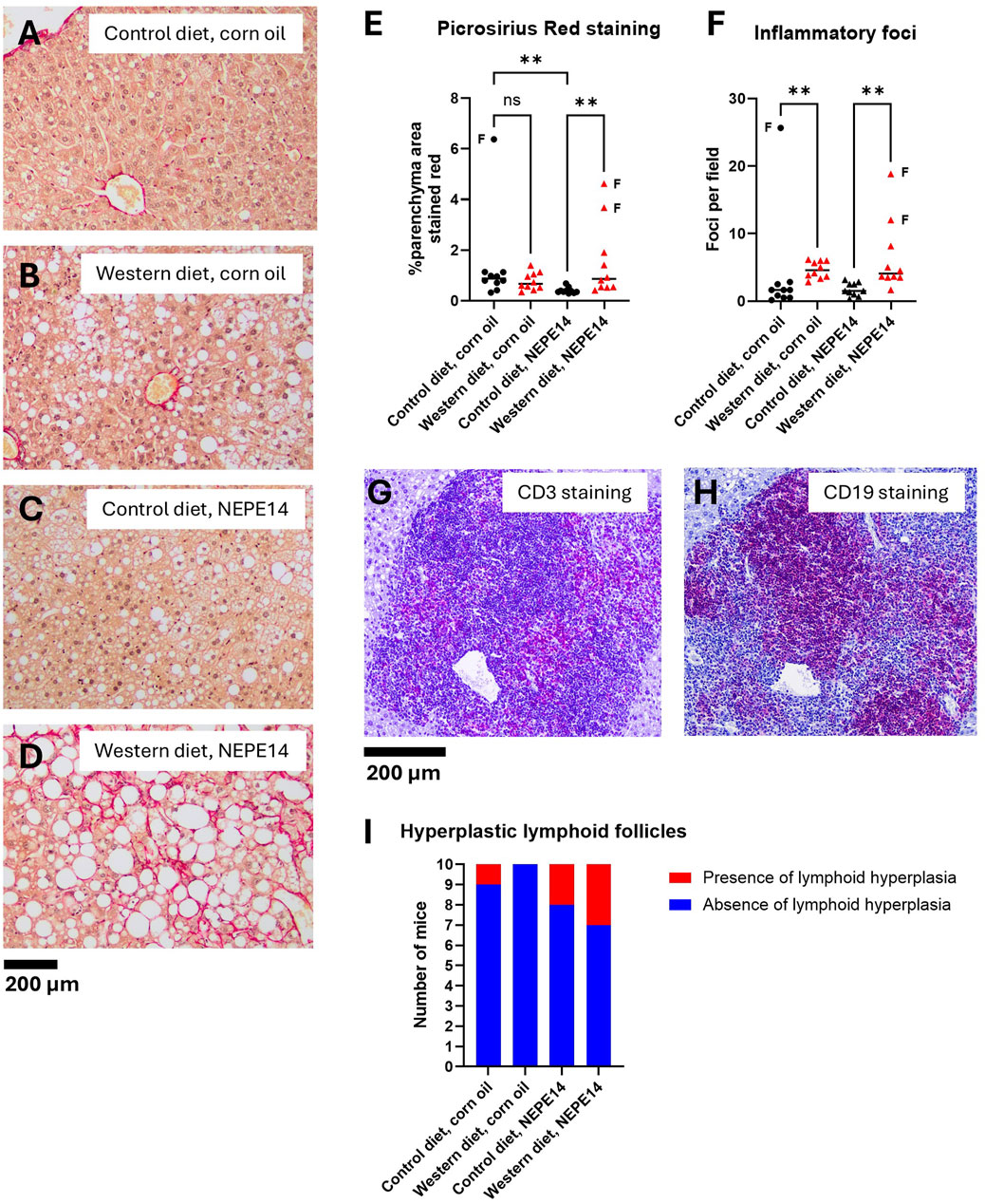 The Western diet promotes liver inflammation. Examples of liver sections stained with picrosirius red from each of the four treatment groups (A–D). The sample in (D) was taken from one of the mice with a stiff, fibrotic liver. (E) Quantification of parenchymal PSR stained area. (F) Counting of inflammatory foci from H&E stained liver sections. In panels E and F, the horizontal lines indicate medians. The data points indicated by letter “F” are from stiff, fibrotic livers. ns: not significant. **: P < 0.01 for post-hoc comparisons after Kruskal-Wallis test with Dunn’s test. (G,H) An example of immunohistochemistry of a hyperplastic lymphoid follicle from a mouse fed the control diet and exposed to NEPE14 with the red-purple color demonstrating the occurrence of both CD3e-positive (G) and CD19-positive cells (H). (I) Incidence of mice with hyperplastic lymphoid follicles observed in H&E stained liver sections.