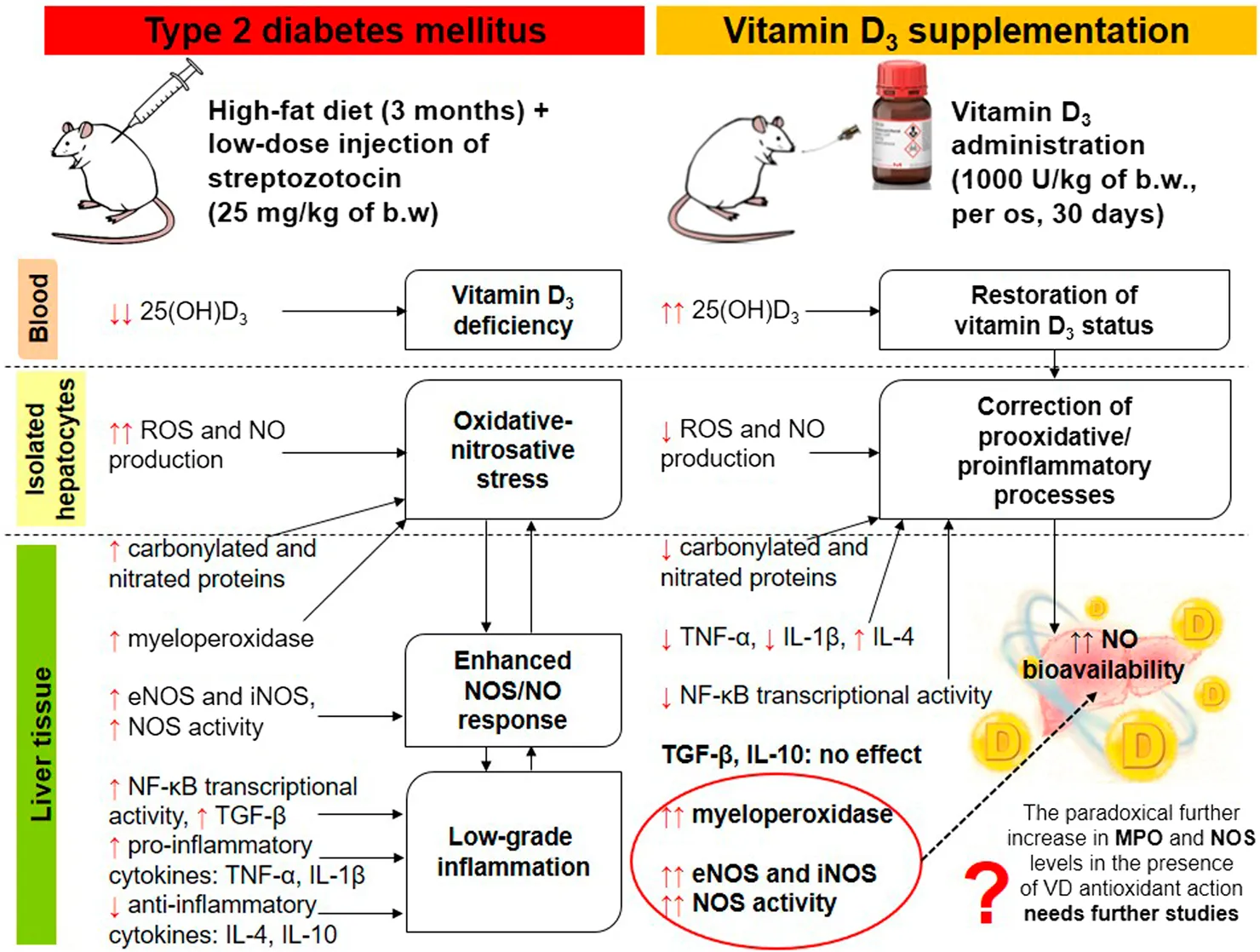 As NO signaling pathway is not only affected by vitamin D3 levels but also closely related to MASLD through a series of mechanisms, such as pro/anti-inflammatory imbalance, immune disorders, and oxidative stress, the effect of cholecalciferol on T2DM-elicited liver abnormalities may be achieved via regulation of the NO system. The trial was therefore performed to explore the effects of vitamin D3 on hepatocellular oxidative-nitrosative stress and NF-κB-mediated expression of pro/anti-inflammatory cytokines in association with the levels of NO synthases (eNOS, iNOS) and nitric oxide generation in experimental T2DM.