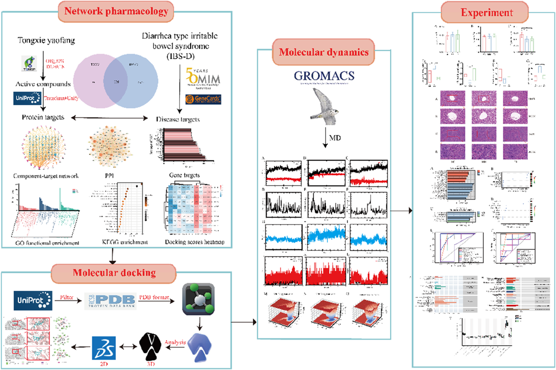 Network pharmacology is a systems-level approach that integrates pharmacological data to predict the active ingredients, potential targets, and related pathways of complex herbal formulations. It enables the construction of drug–target–disease interaction networks and facilitates functional pathway analysis [7]. Molecular docking simulates the binding of ligands to target proteins, predicting the interaction modes and affinities of drug–target pairs [8]. Molecular dynamics further refines this analysis by simulating receptor–ligand movements via Newtonian mechanics, thereby assessing binding stability over time [9]. These methods, which emphasize multicomponent and multitarget synergy, are particularly suitable for elucidating the pharmacological mechanisms of complex formulae such as Tongxie Yaofang.