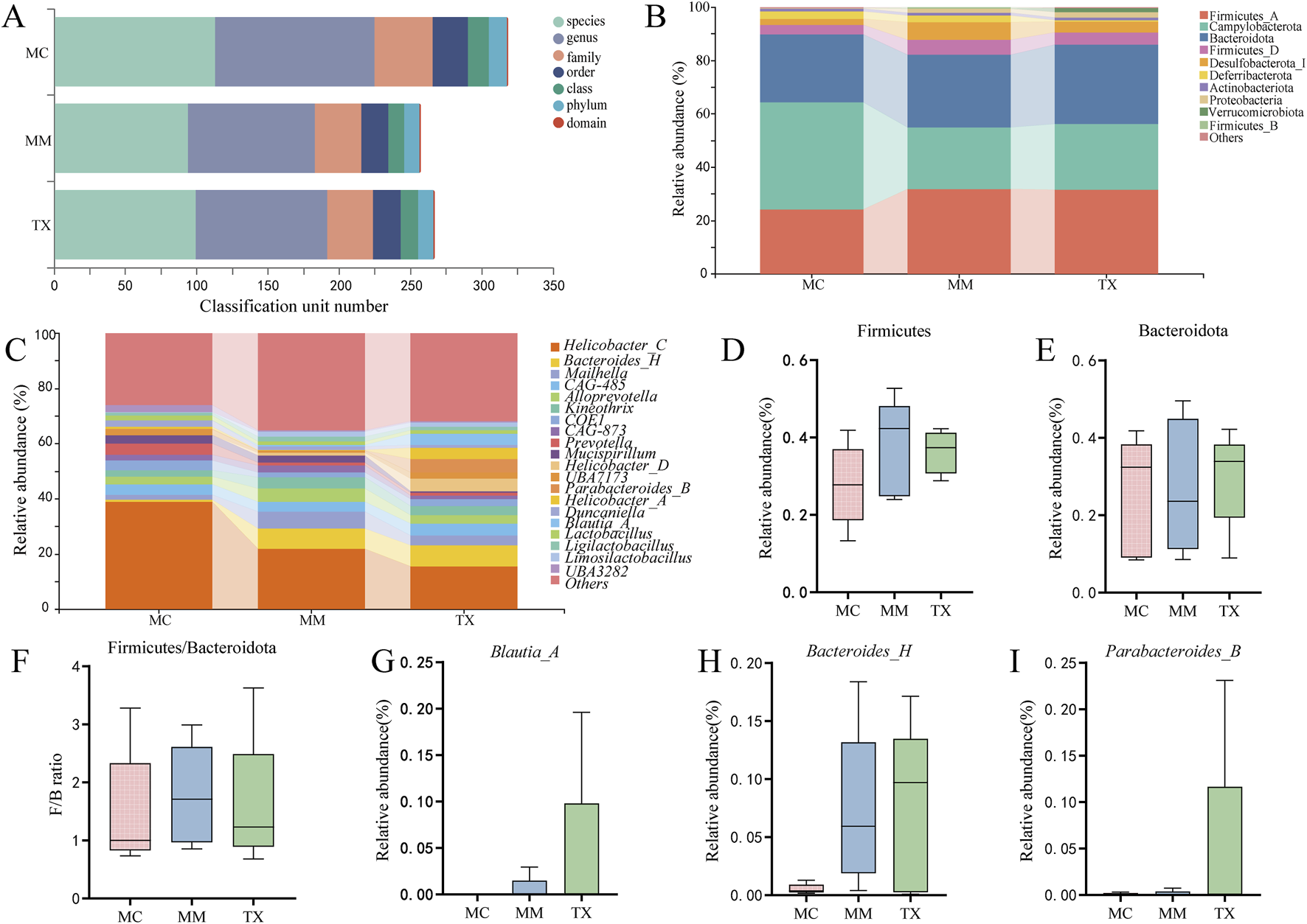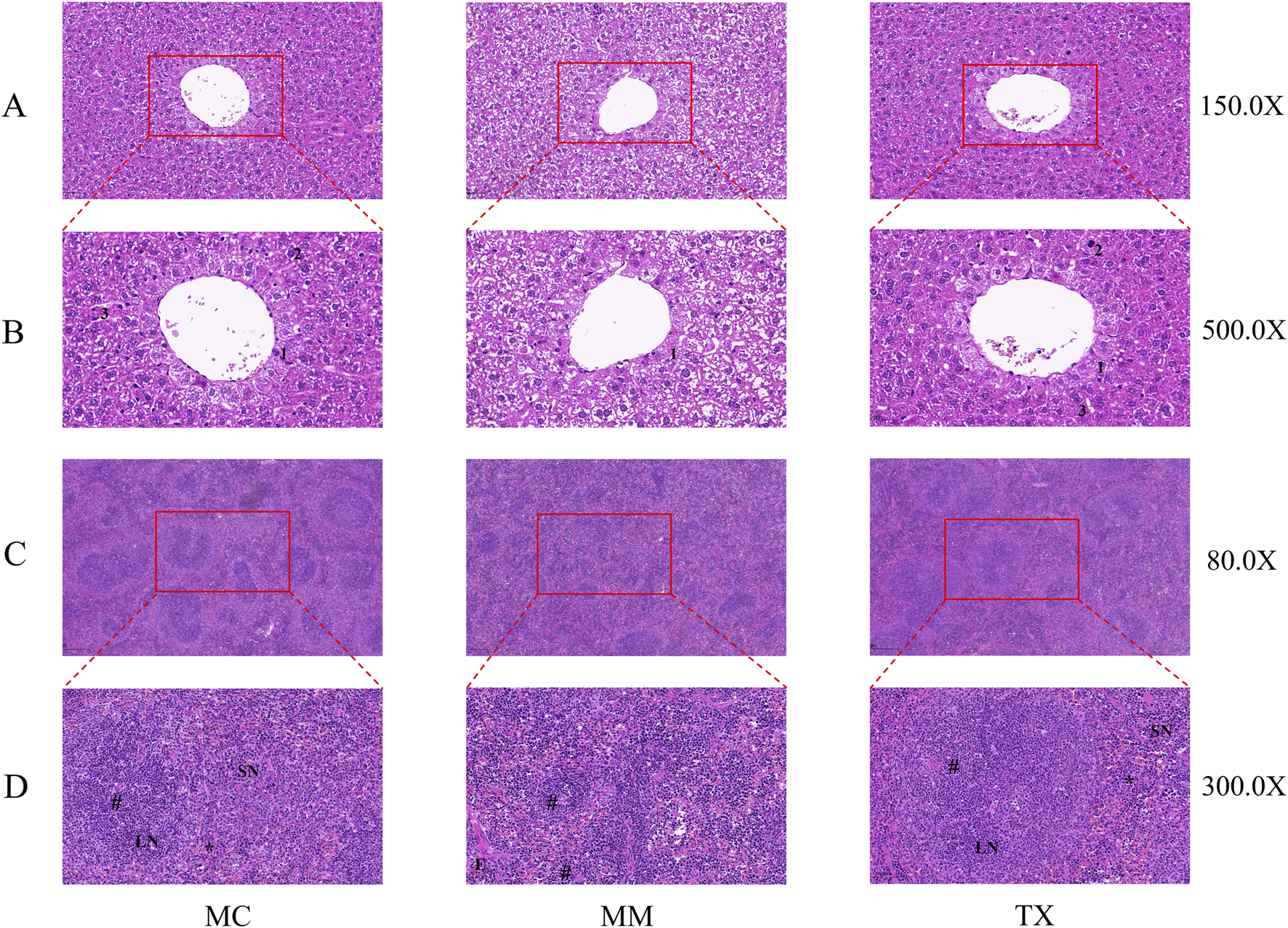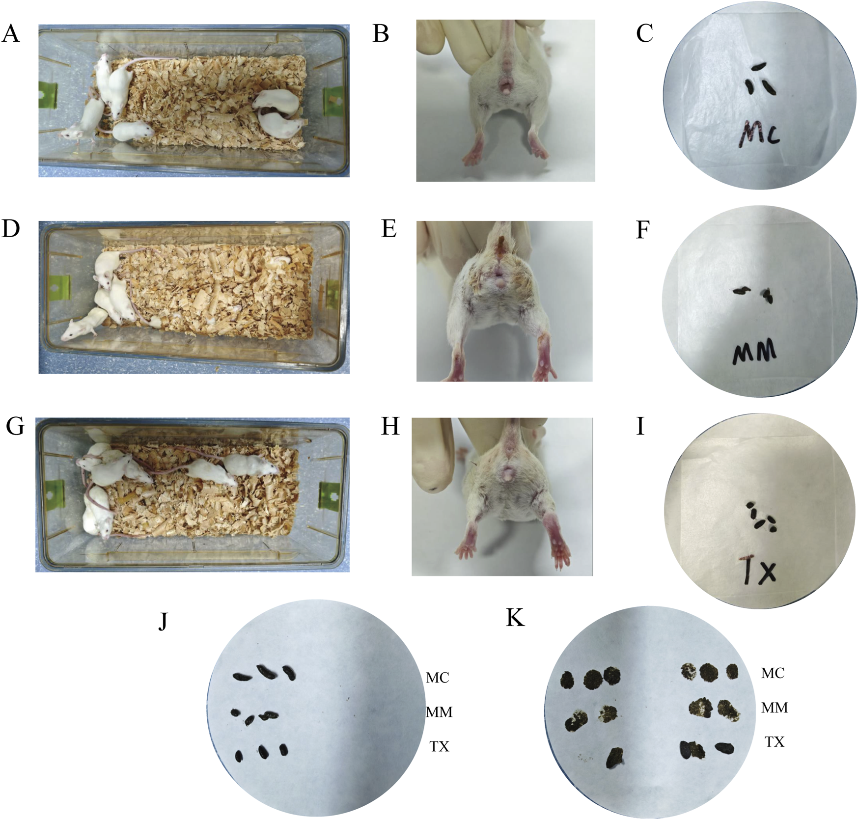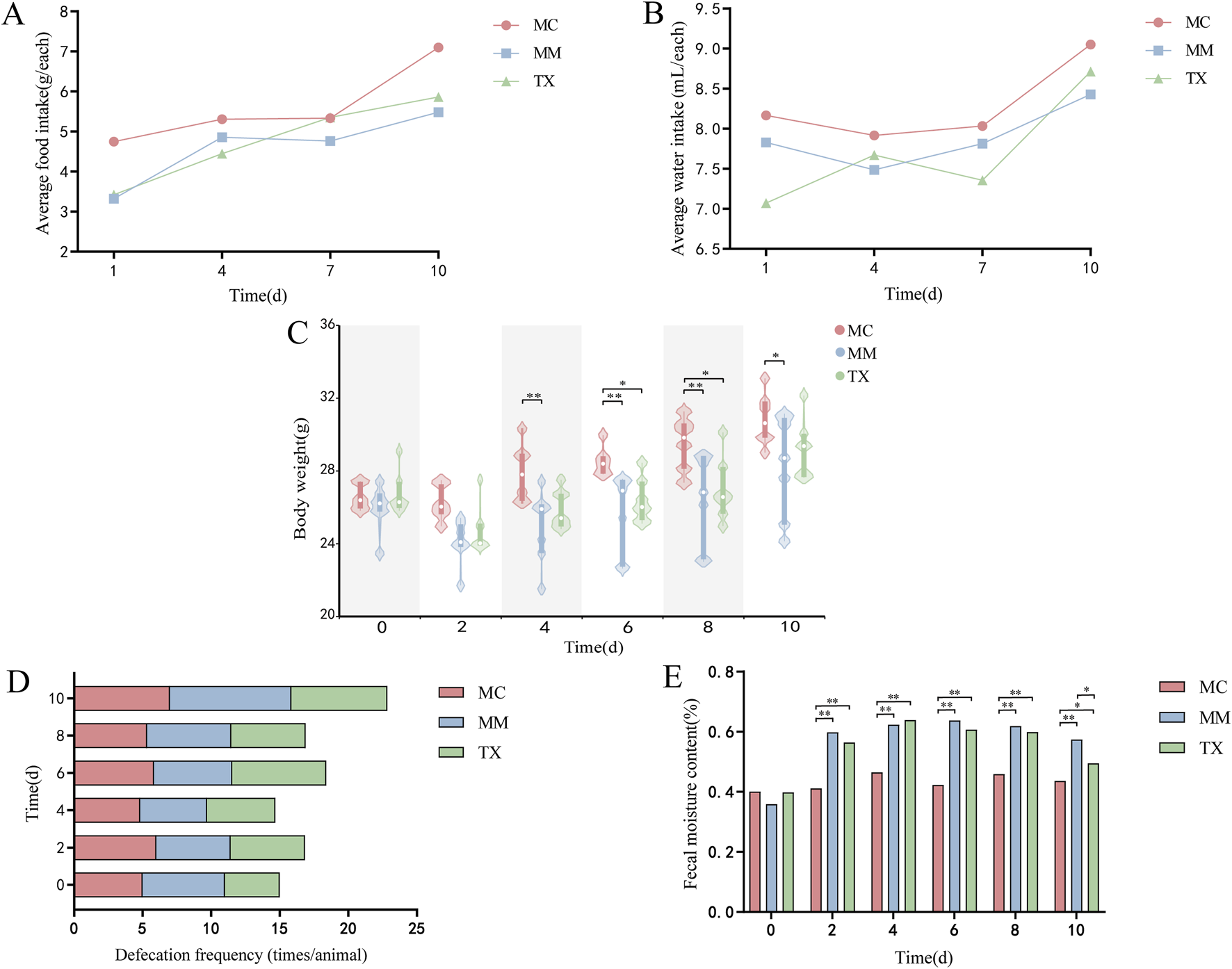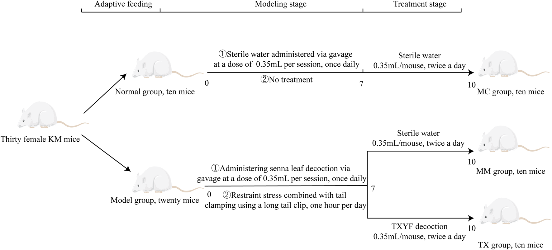 Modeling phase: Following 5 days of adaptive feeding, 30 mice were randomly allocated into two groups: a normal control (MC) group (n = 10) and a model (MM) group (n = 20). The modeling procedure was adapted on the basis of a previously published method [20]. All the mice were fasted for 12 h before each gavage. Each morning at 08:30, the mice in the MM group were orally supplied 0.35 mL of Senna alexandrina Mill. to produce spleen deficiency diarrhea, while the MC group received an equivalent dose of distilled water. At 15:00, the mice were subjected to restraint stress by placement in centrifuge tubes to restrict limb movement, while tail-clamping stimulation with long hemostatic clips was applied for 1 h. The procedure involved 15-min intermittent rest periods and was repeated four times. During the modeling phase, mice in both the MM and TX groups were subjected to fasting and water deprivation for seven consecutive days, whereas mice in the MC group had free access to food and water.