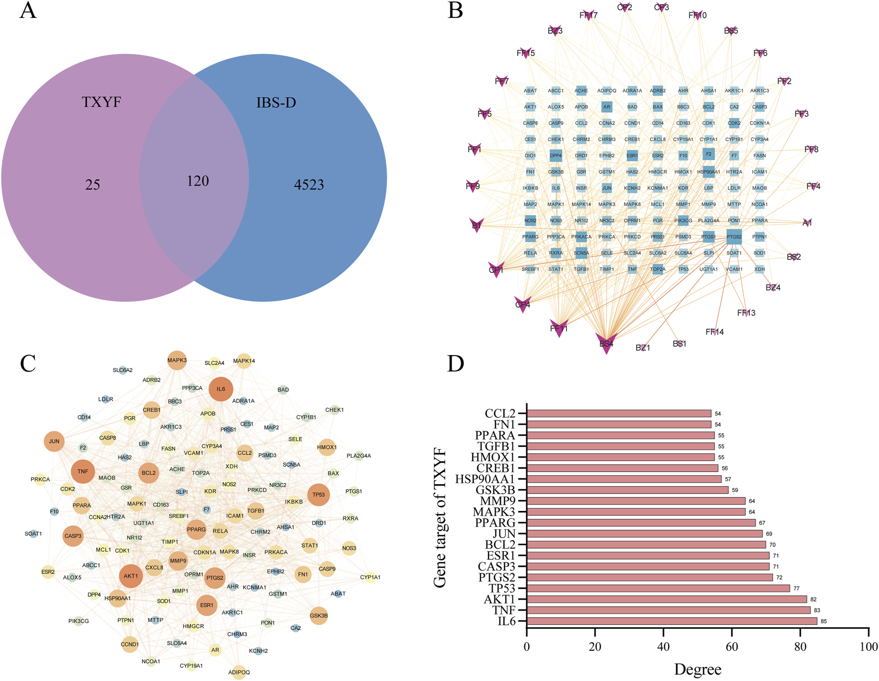 Network pharmacology assessment of Tongxie Yaofang. (A) A Venn diagram illustrating the intersection between the target genes of the active components of Tongxie Yaofang and the target genes associated with IBS-D; (B) The network was established with 28 active compounds and 120 gene targets of Tongxie Yaofang. The rectangular nodes signify gene targets, while the V-shaped nodes denote active substances. The depth of nodes exhibits a positive correlation with the degree value; (C) PPI network diagram of Tongxie Yaofang syndrome and IBS-D. Nodes signify targets, while edges denote protein-protein interactions. The color and size of nodes exhibit a positive correlation with the degree value, where a larger node size signifies greater importance; (D) The PPI network identified the top 20 gene targets of Tongxie Yaofang and IBS-D.