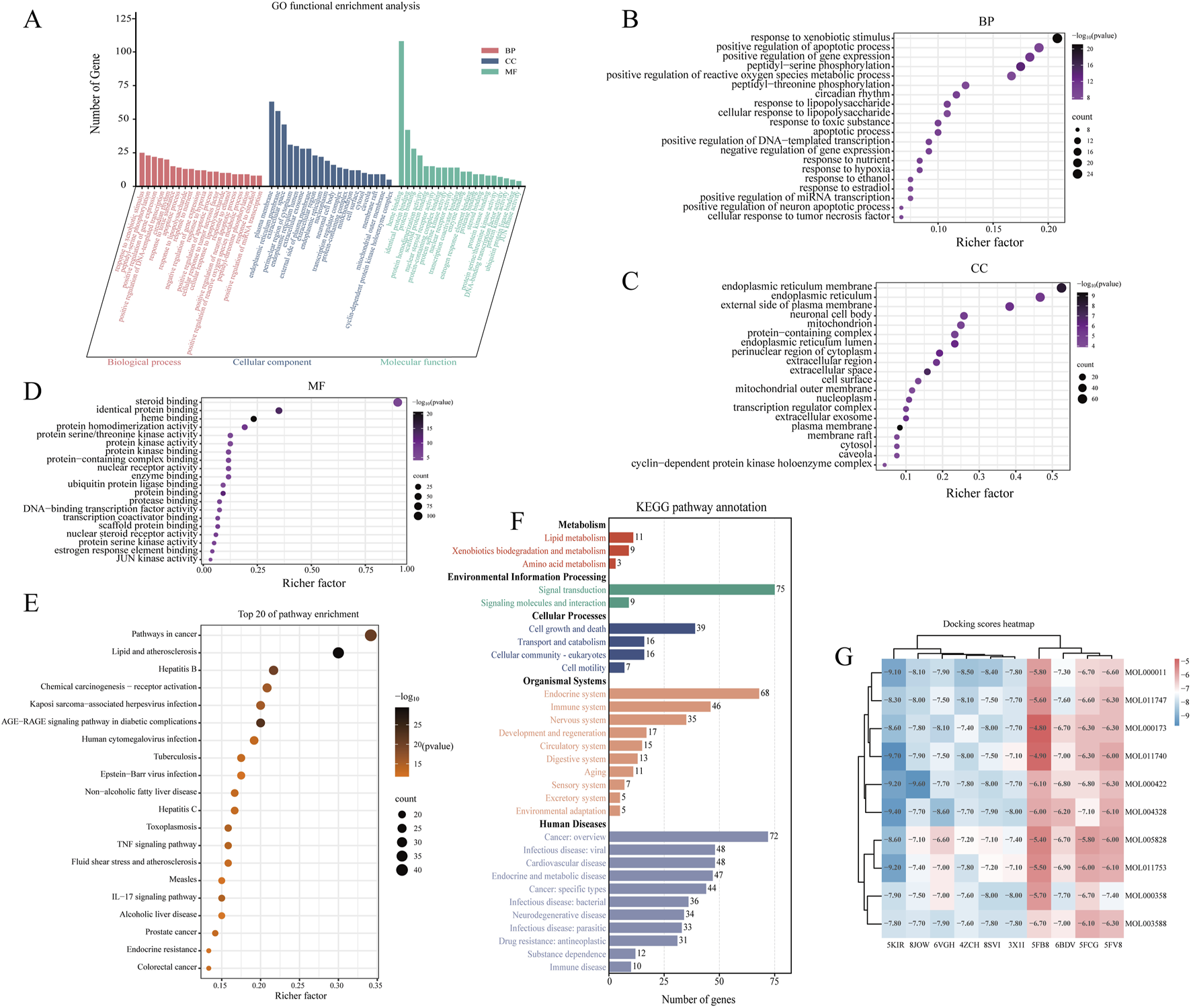 Network pharmacology analysis of Tongxie Yaofang. (A) GO functional enrichment analysis of the top 20 of the 120 gene targets; (B) Top 20 GO enrichments in BP; (C) Top 20 GO enrichments in CC; (D) Top 20 GO enrichments in MF. The X-axis represents the degree of gene enrichment, and the color of the dots represents the corresponding P value. Larger dots indicate that more genes are enriched; (E) KEGG top 20 enriched pathways. Larger dots indicate that more genes are enriched in the corresponding pathways; (F) KEGG pathway annotation. Bar graphs of different colors represent different aspects of the annotations of the 120 gene target pathways; (G) Heatmap of the molecular docking binding energy of TCM components and therapeutic targets.