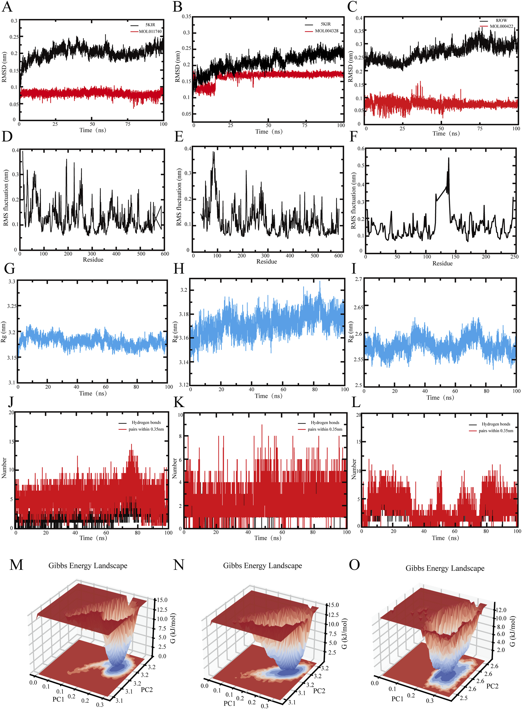 The simulation stability was evaluated by the root mean square deviation (RMSD), the radius of gyration (Rg), the root mean square fluctuation (RMSF), and hydrogen bond analyses. Gibbs free energy landscapes for each complex were calculated and visualized via the DuIvyTools Python library [18].