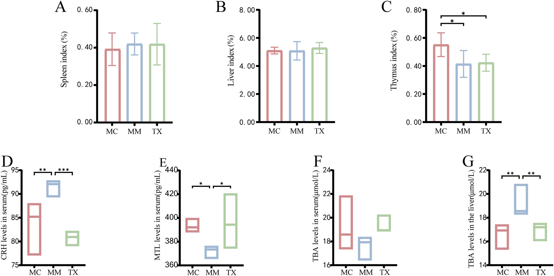 Each mouse was weighed prior to blood collection and then euthanized by cervical dislocation. Blood samples were obtained and allowed to clot, and then centrifuged at 4 °C and 3000 revolutions per minute for 10 min. The serum was collected to analyze MTL, CRH, and TBA levels via ELISA kits. Following euthanasia, approximately 0.1 g of liver tissue was excised with sterile scissors, accurately weighed on an analytical balance, homogenized with saline and steel beads, and centrifuged under the same conditions. The supernatant was subsequently used to measure hepatic total bile acid content according to the ELISA kit protocol [25].