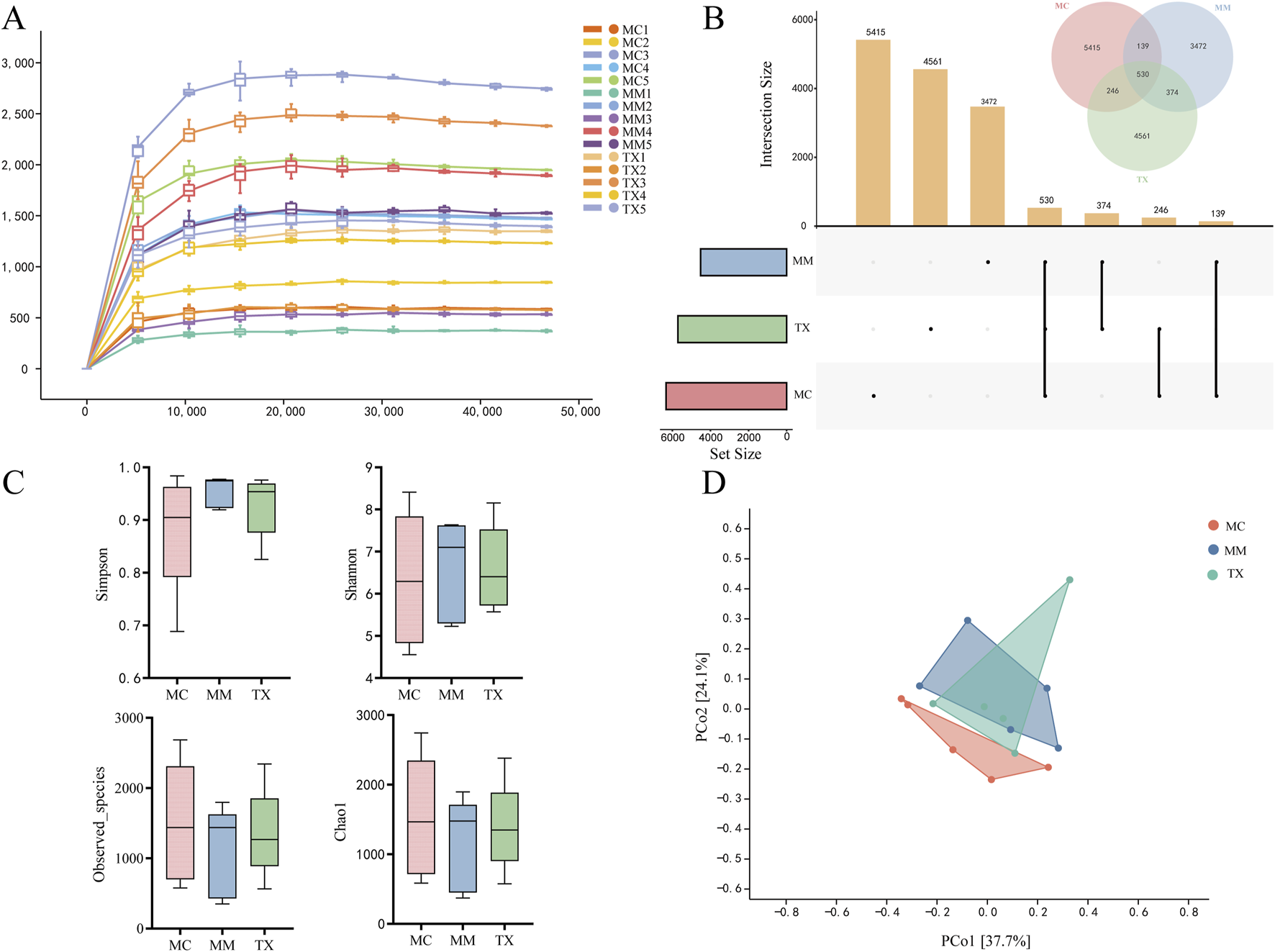 (3) Beta diversity: Using the flattened ASV/OTU table, the weighted UniFrac distance matrix was calculated according to the “qiime diversity core-metrics-phylogenetic” command of the tree file, and PCoA was conducted. QZV files were visualized on12, and PCoA plots were generated in R.