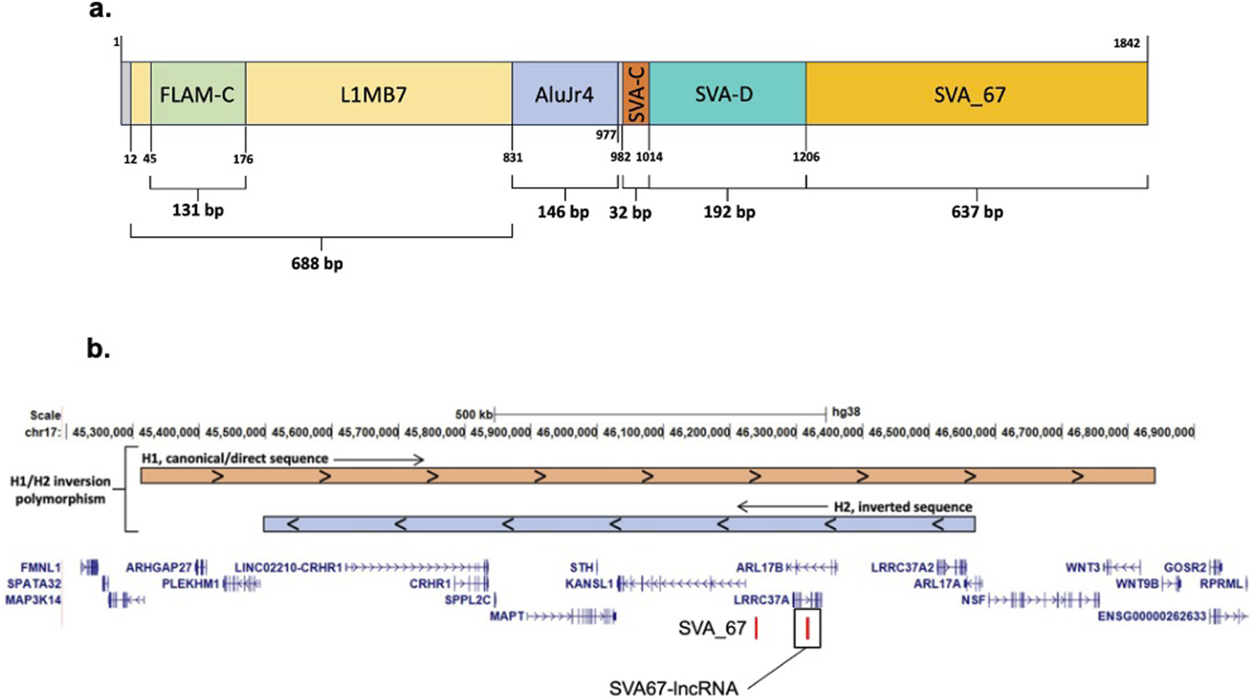 SVA67-IncRNA structure and schematic representation of the location of SVA_67. (a) Structure of entire SVA67-IncRNA cDNA Template, including the SVA_67 (IMAGE clone 4151959, GenBank reference BC011194). Structure of Plasmid template used for transfection in this study. Total length is 1842bp. (b) Schematic modified from UCSC genome browser hg38 and Frohlich et al. [16] of the MAPT locus on chromosome 17 showing the location of SVA_67 and the SVA67-IncRNA.