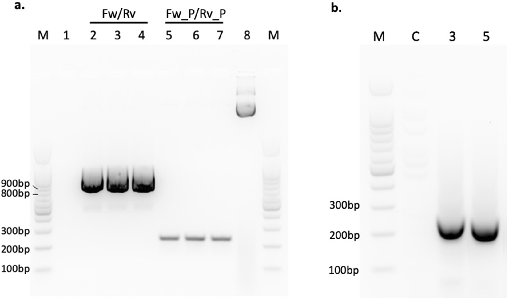 Preparation of SVA67-IncRNA and confirmation of transfection. (a) Image of amplicons of engineered plasmid after bacterial revival and plasmid extraction. Lane “M” represents a 100bp DNA ladder. Lane 1 represents a negative control. Fw/Rv primers expected length of 839bp was achieved as was the expected length of 210bp for Fw_P/Rv_P primers. The amplicon in lane 8 was the plasmid alone. (b) Image of amplicons to confirm transfection of SVA67-IncRNA into cell line. Lane “M” represents a 100bp DNA ladder. “C” represents an un-transfected sample, “3” and “5” represent the concentration of transfected SVA67-IncRNA (μg). IncRNA_SVA_67 Fw/Rv primers were used with an expected amplicon length of 241bp.