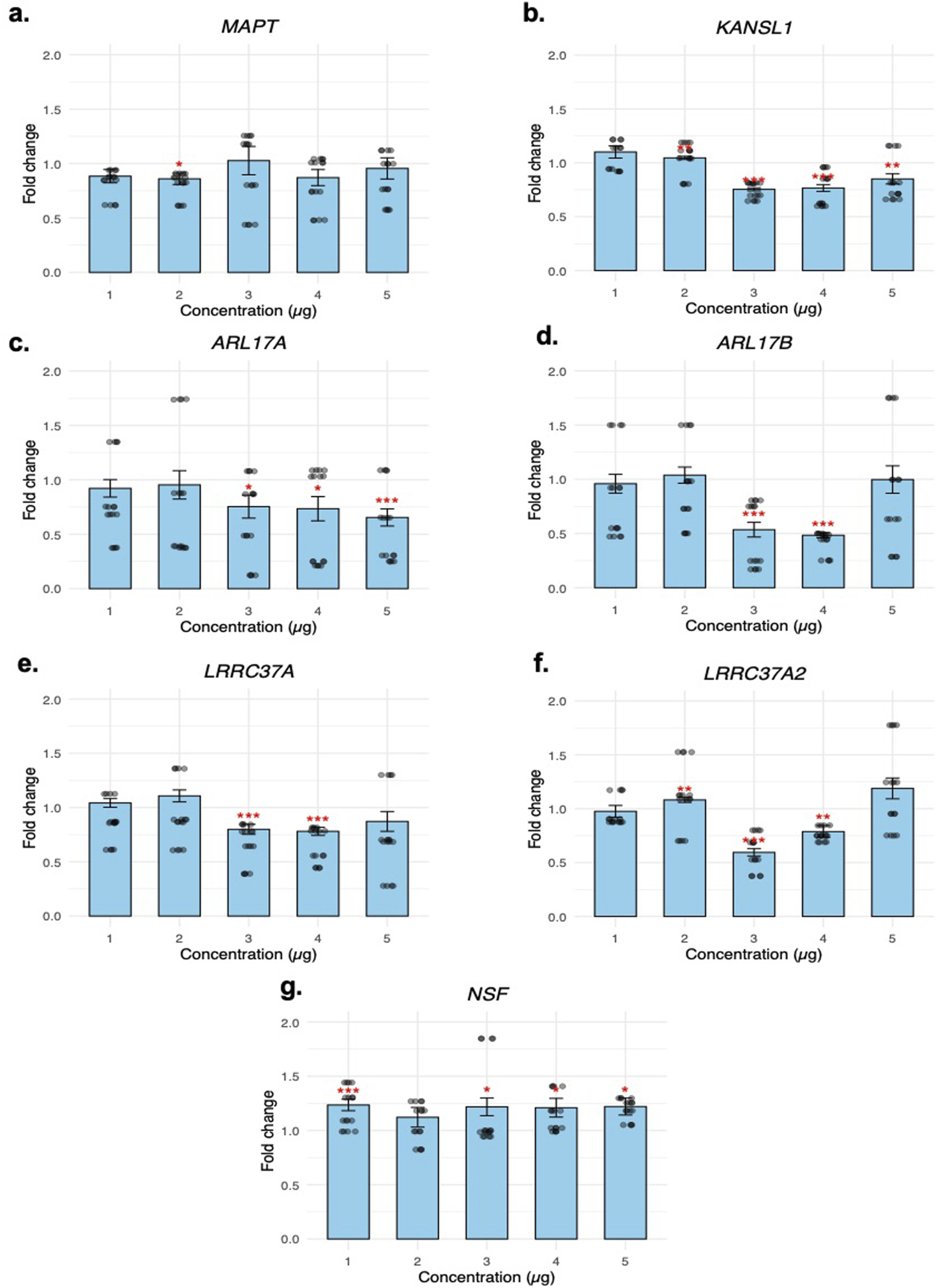 Fold change results of each target gene at increasing concentrations of transfect SVA67-IncRNA. Target gene expression results of (a) MAPT (b) KANSL1 (c) ARL17A (d) ARL17B (e) LRRC37A (f) LRRC37A2 (g) NSF are calculated by comparison to an empty vector sample to generate a fold change result. A Welch’s T-test was performed to determine statistical significance. *p < 0.05, **p < 0.01, ***p < 0.001. Raw fold change replicate scores are plotted using a jitter plot.