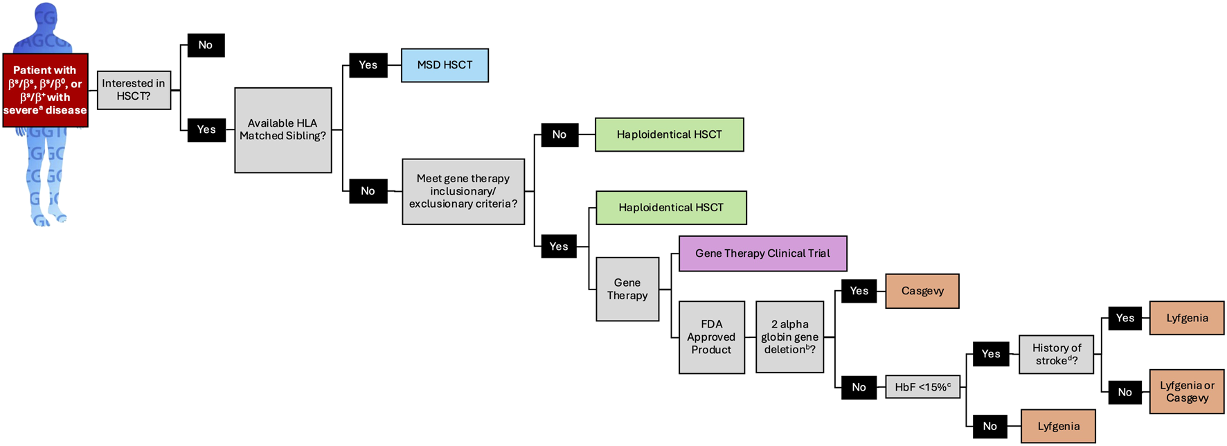 A Patient Selection Algorithm for FDA Approved SCD Genetic Therapies Based on Clinical Trial Design and Data. a. see Table 1 for definition of severe SCD as defined for lovo-cel and exa-cel. b. a limitation of use for Lyfgenia has been noted for patients with α-thalassemia trait or more than two α globin deletions. c. HbF >15% irrespective of HU was exclusionary to receive exa-cel. FDA: food and drug administration; HbF: fetal hemoglobin; HLA: human leukocyte antigen; HSCT: hematopoietic stem cell transplantation; MSD: matched sibling donor.