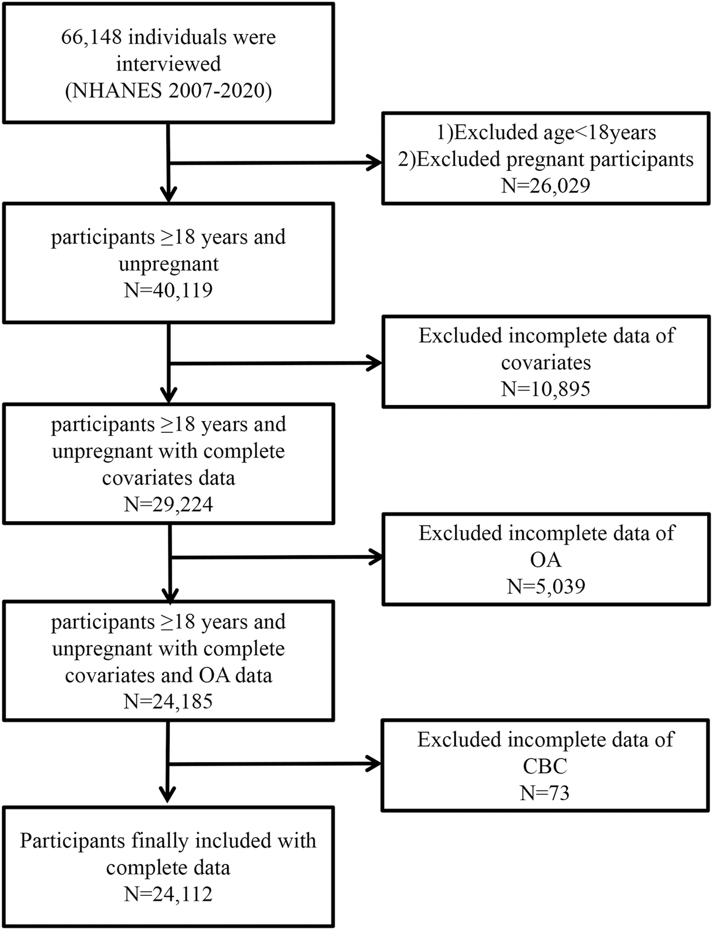 Of the NHANES 2007–2020 data, 66,148 individuals were recognized. The exclusion criteria were as follows: (1) individuals younger than 18 years or pregnant; (n = 26,069); (2) participants with missing covariate data (n = 10,895); (3) participants without osteoarthritis information (n = 5,039); (4) participants without CBC data (n = 73). In the end, 24,112 individuals participated in the present research. Figure 1 depicts the complete data selection procedure. Every piece of statistical data used in the present study is publicly accessible and demographically weighted for further study.