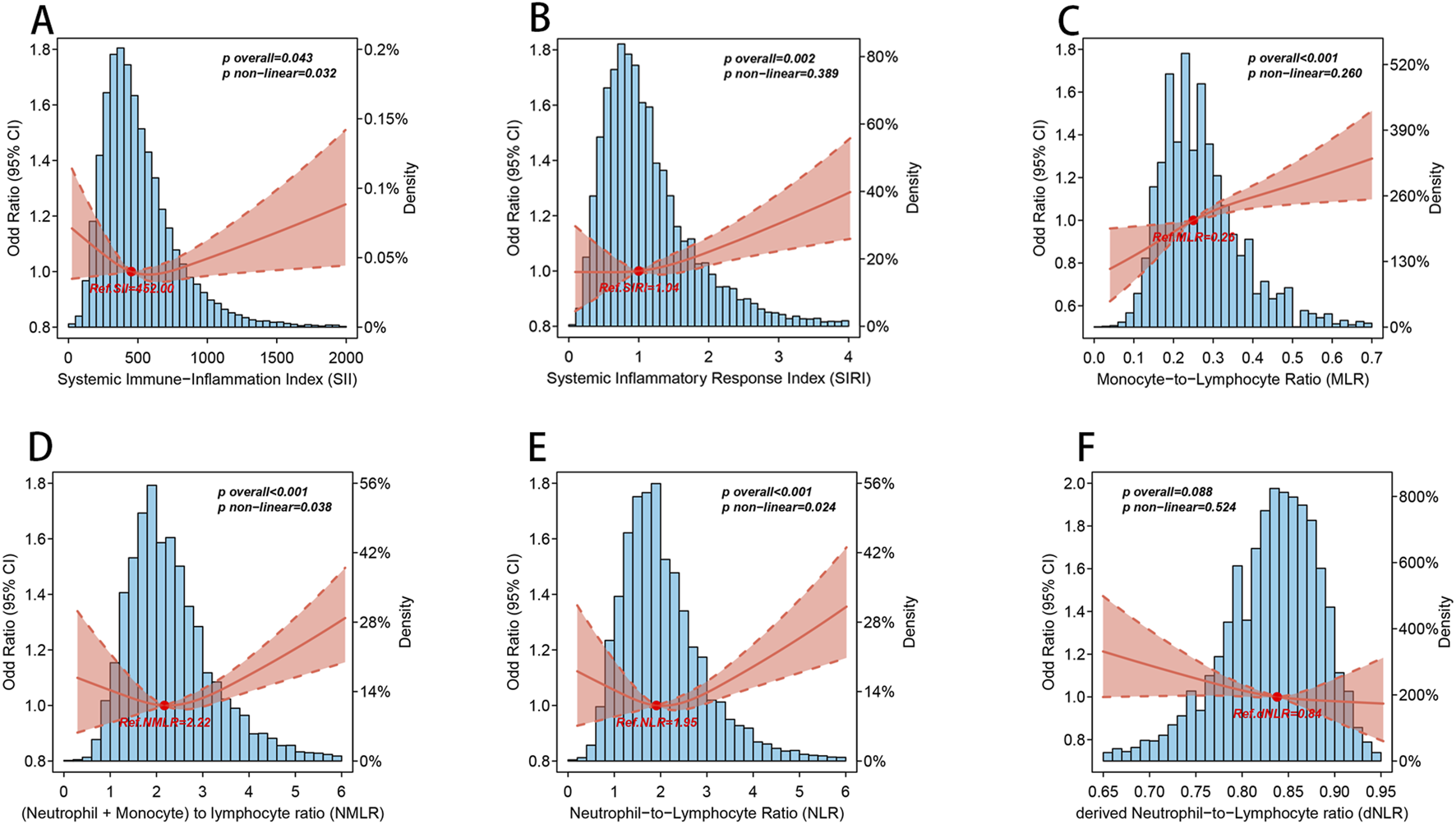 OA is a multifactorial disease influenced by aging, genetic susceptibility, obesity, and, in particular, inflammatory processes [6, 7], with specific inflammatory biomarkers being key indicators of disease progression. Emerging evidence indicates that TNF-α and IL-1β are key inflammatory mediators in OA. These cytokines interact with multiple signaling pathways to promote further cytokine release and are involved in the pathogenesis of OA [8]. Systemic inflammatory responses can be assessed using complete blood count (CBC)-derived inflammatory indicators, which are calculated from routine blood count parameters and include systemic immune inflammatory index (SII), systemic inflammatory response index (SIRI), monocyte-to-lymphocyte ratio (MLR), (neutrophil + monocyte)-to-lymphocyte ratio (NMLR), neutrophil-to-lymphocyte ratio (NLR), and derived NLR (dNLR). Peripheral platelets, lymphocytes, and neutrophils together comprise these inflammatory markers, which constitute a comprehensive set of parameters used for prognosis. Compared with a single inflammatory signal, they can more comprehensively reflect the host’s immune-inflammatory status [9, 10], highlighting their potential as key indicators of the body’s inflammatory and immune status. In addition, since CBC-derived inflammatory indicators are readily obtained from routine complete blood counts, they are easy to use in clinical applications.