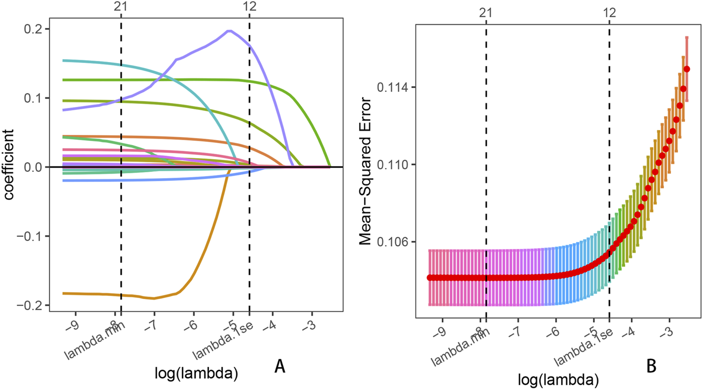 Subsequently, a predictive model was constructed and validated. First, variables were screened and regressed using LASSO regression, and the optimal lambda was selected via cross-validation to determine the best prediction model. The risk prediction model was visually represented as a nomogram that quantifies the overall likelihood of developing OA by assigning weighted scores to various factors based on their risk contributions. To construct the nomogram, the VIFs for each predictor (Supplementary Table S3) were also computed to assess potential multicollinearity further. Finally, the specificity and sensitivity of the model were evaluated by ROC curve analysis and the corresponding AUC. Internal validation was also performed using the bootstrap resampling method, with 1,000 bootstrap samples generated to estimate the model’s accuracy and stability. In addition, decision curve analysis and calibration curves were performed to evaluate the model’s clinical utility and the accuracy of its predicted probability.