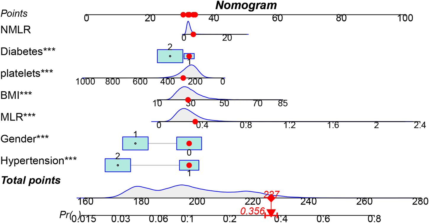 The NHANES mobile examination center (MEC) used the Beckman Coulter DxH 800 device to analyze CBCs on blood samples and report blood cell distribution for each individual. The procedure was overseen by qualified medical staff. Subsequently, using certain mathematical formulae based on the complete counts of various blood cell subpopulations, we computed the following inflammatory indicators: SII, SIRI, MLR, NMLR, NLR, and dNLR. SII = neutrophil counts × platelet counts/lymphocyte counts, SIRI = neutrophil counts × monocyte counts/lymphocyte counts, MLR = monocyte counts/lymphocyte counts, NMLR = (neutrophil counts + monocyte counts)/lymphocyte counts, NLR = neutrophil counts/lymphocyte counts, dNLR = neutrophil counts/(white blood cell counts-lymphocyte counts).