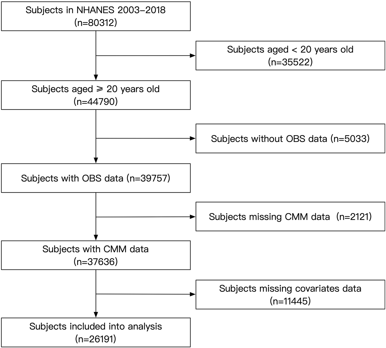 For this analysis, we included subjects who participated in NHANES between 2003 and 2018 (N = 80,312). Exclusion criteria included individuals under 20 years of age and those with missing data on OBS, CMM, or other covariates. After applying these criteria, a total of 26,191 participants were included in the study (Figure 1). The NHANES protocol was approved by the NCHS Institutional Ethics Review Board, and as our study utilized de-identified data, no additional ethical review was required. All data used in this study are publicly available through the official NHANES website.