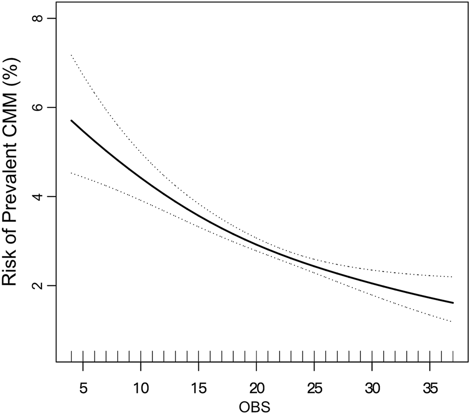 Smooth curve fitting illustrating the linear relationship between OBS and prevalent CMM. The model was adjusted for age, sex, race, PIR, BMI, WC, SBP, FPG, TC, HDL-C, eGFR, anti-hypertensive therapy, and anti-diabetic therapy, consistent with Model 2 in Table 2. The solid line represents the estimated risk of prevalent CMM, while the dotted lines indicate the pointwise 95% confidence intervals. The association remained linear across the entire range of OBS.