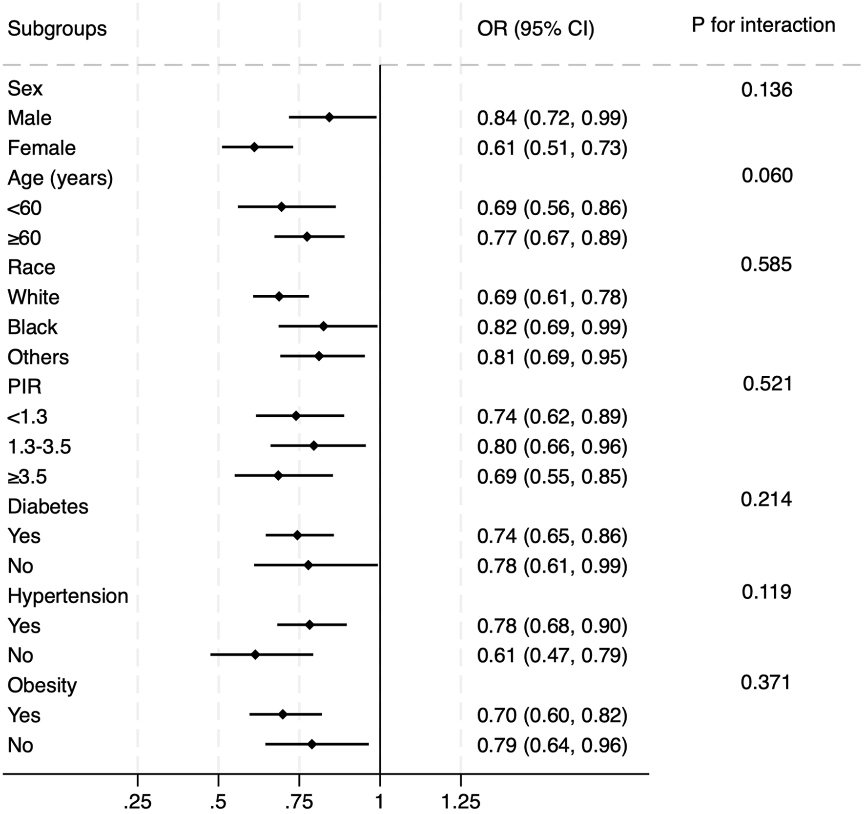 | Dietary OBS (per SD increase) | 0.672 (0.609–0.741) | <0.001 | 0.730 (0.656–0.813) | <0.001 | 0.755 (0.670–0.850) | <0.001 |