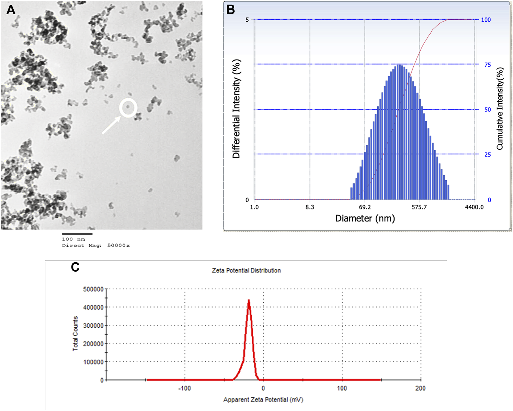 SiO2 NPs were characterized by TEM, DLS, and Zeta Potential. (A) A TEM micrograph of SiO2 NPs suspension on a copper coated grid. The micrograph shows single particles (encircled) among particle clumps. Average particle size measured 20 nm. (B) Representative distribution of particle size in aqueous suspension of amorphous SiO2 NPs measured using DLS. The average hydrodynamic diameter was measured as 226 nm. (C) Zeta Potential distribution of amorphous SiO2 NPs in water was measured as −20 mV.