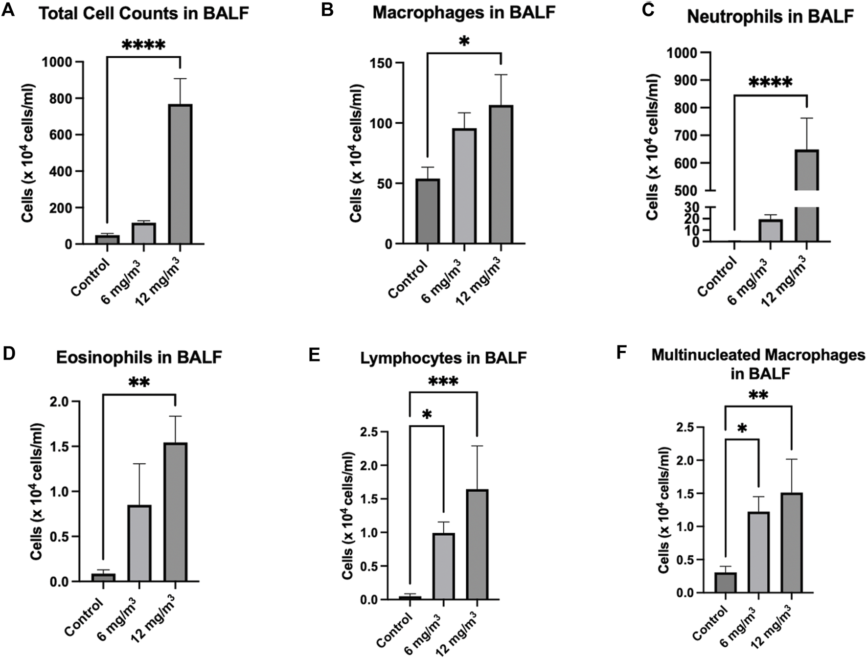Total Cells and leukocytes in the bronchoalveolar lavage fluid (BALF) of Golden Syrian Hamsters were counted to determine if inflammation was occurring after exposure to inhaled SiO2 NPs. The cells were re-suspended in 1 mL of RPMI media followed by determination of total cell numbers (A). Total Cell numbers (A) were significantly increased by 16-fold in the 12 mg/m3 treated group. Differential cell count (B–F) slide smears were prepared from the BALF of cells from the lung exposed to 6 and 12 mg/m3 SiO2 NPs for 4h/day for 8 days. Macrophages (B) of treated groups were not changed when compared to control. Neutrophils (C), Eosinophils (D), Lymphocytes (E), and Multinucleated Macrophages (F) were significantly increased in the 12 mg/m3 treated group when compared to control. N = 5.