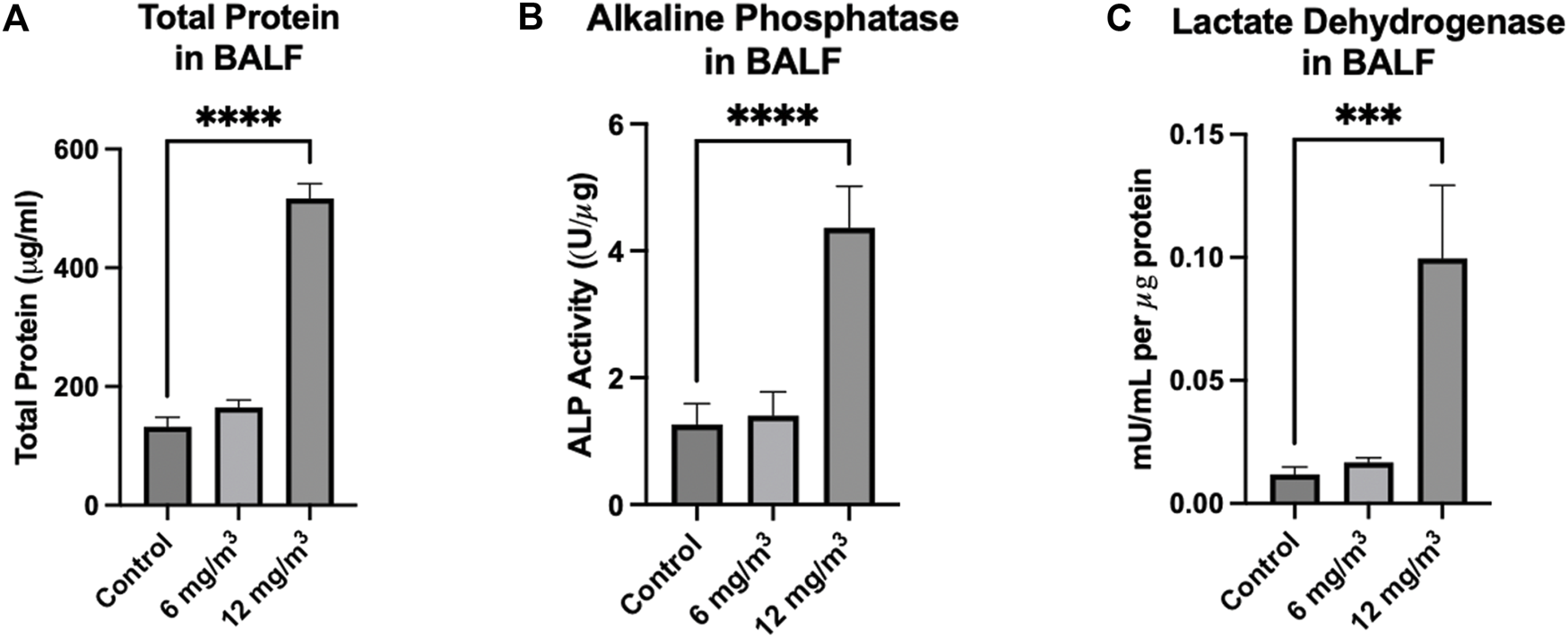 Total Protein in the BALF was significantly increased from 133 ± 15 μg/mL in the controls to 517 ± 25 μg/mL in the 12 mg/m3 group (Figure 3A; Supplementary Figure S3). ALP activity in the BALF was significantly elevated in the 12 mg/m3 group (4.4 ± 0.6 U/μg) when compared to vehicle control (1.3 ± 0.3 U/μg) (Figure 3B; Supplementary Figure S3). LDH activity in the BALF was significantly increased in the 12 mg/m3 group (99 × 10−3 ± 29 × 10−3 mU/mL), when compared to vehicle control (11 × 10−3 ± 2.9 × 10−3 mU/mL) (Figure 3C; Supplementary Figure S3).