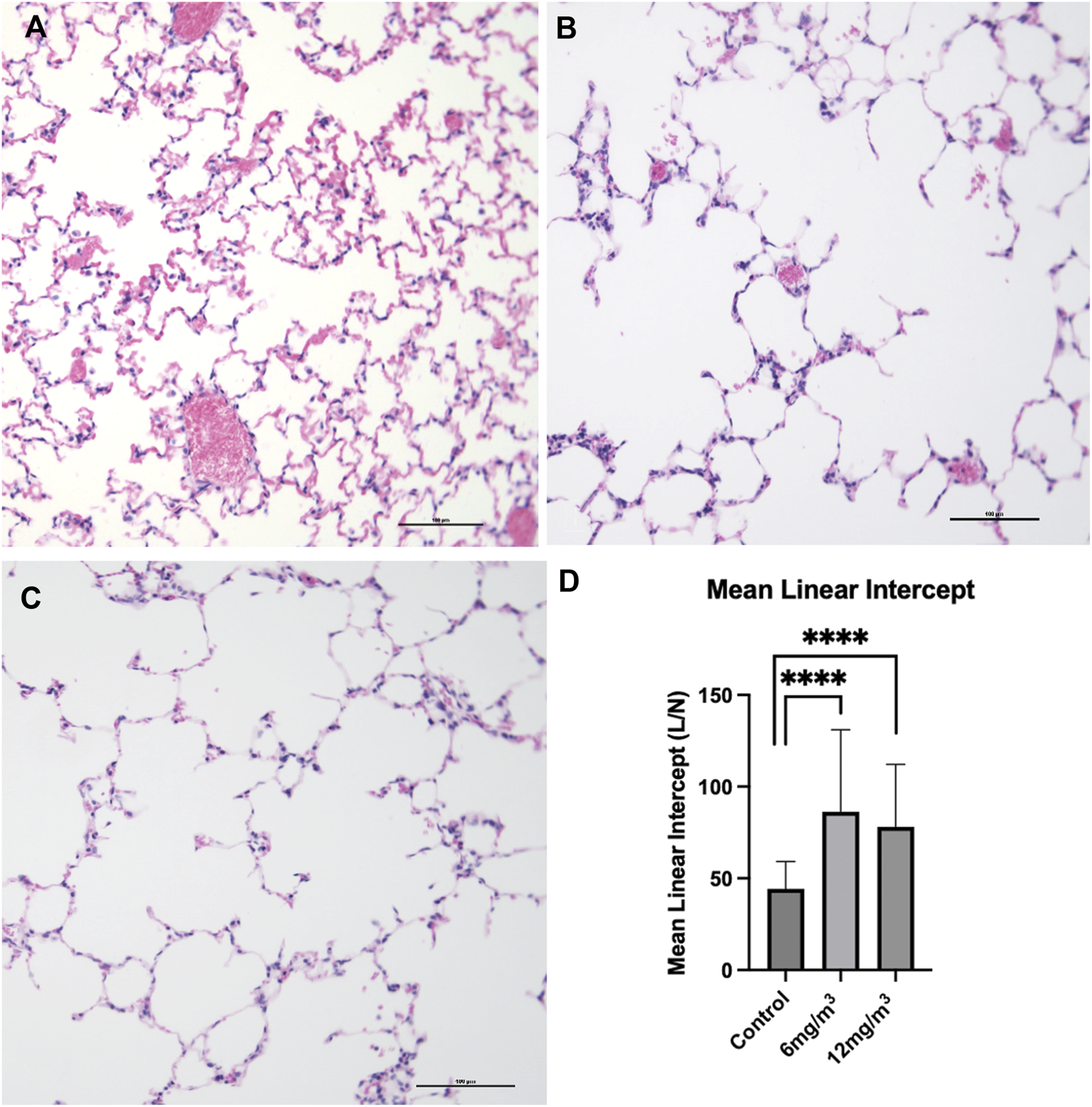 The photomicrographs are of formalin fixed, H&E-stained tissue sections from the lungs of (A) vehicle control (water), (B) 6 mg/m3 and (C) 12 mg/m3 SiO2 NP treated groups. The micrographs show progressive increase in air space quantified by Mean Linear Intercept (D). Mean Linear Intercept was measured by the line intersection method and calculated from 20 random fields of view per animal. The Mean Linear Intercept of both 6 mg/m3 and 12 mg/m3 SiO2 NP treated animals was significantly increased when compared to vehicle control (water).