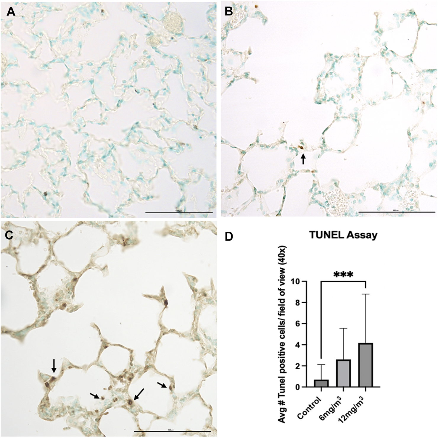 The photomicrographs are of formalin fixed tissue sections from the lungs of (A) vehicle control (water), (B) 6 mg/m3 and (C) 12 mg/m3 SiO2 NP treated groups. The TUNEL Assay-stained tissue sections for TUNEL positive cells (apoptotic bodies). The micrographs show an increase with increased concentration of NPs with a concomitant increase in the number of apoptotic bodies. Arrows indicate apoptotic bodies. (D) A histogram of the count from the TUNEL assays shows a significant increase in TUNEL positive cells in the high concentration SiO2 NP treated animals compared to vehicle control (water). The average TUNEL positive cells was based on calculated results of 20 random fields of view.