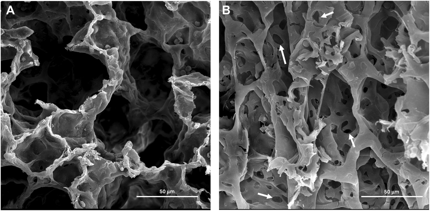 Representative scanning electron micrographs (SEM) of lung tissue from control and treated animals fixed in 3% glutaraldehyde and processed as described in methods. (A) The photomicrograph is from the lungs of a vehicle control (water) animal that shows typical architecture of the alveoli. (B) The lung tissue of an animal treated with 12 mg/m3 shows an atypical architecture of the alveoli with increased holes within the alveoli wall marked by arrows.