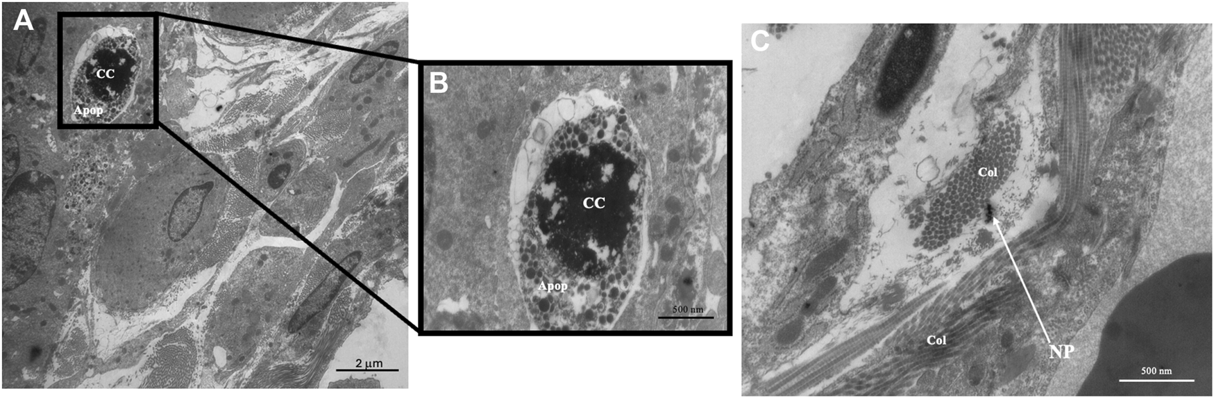 Representative transmission electron micrographs (TEM) of lung tissue from control and treated animals fixed in 3% glutaraldehyde and processed as described in methods. TEM photomicrographs of an interstitial region from a 12 mg/m3 treated animal showing (A) apoptotic bodies and the presence of collagen, original magnification ×5,000. (B) An enlargement of the region of apoptotic bodies, original magnification ×20,000. (C) An interstitial region showing the presence of collagen and SiO2 NPs, original magnification ×20,000. Key: Apoptotic Bodies (Apop), Chromatin Condensation (CC), Collagen (Col), Nanoparticles (NP).