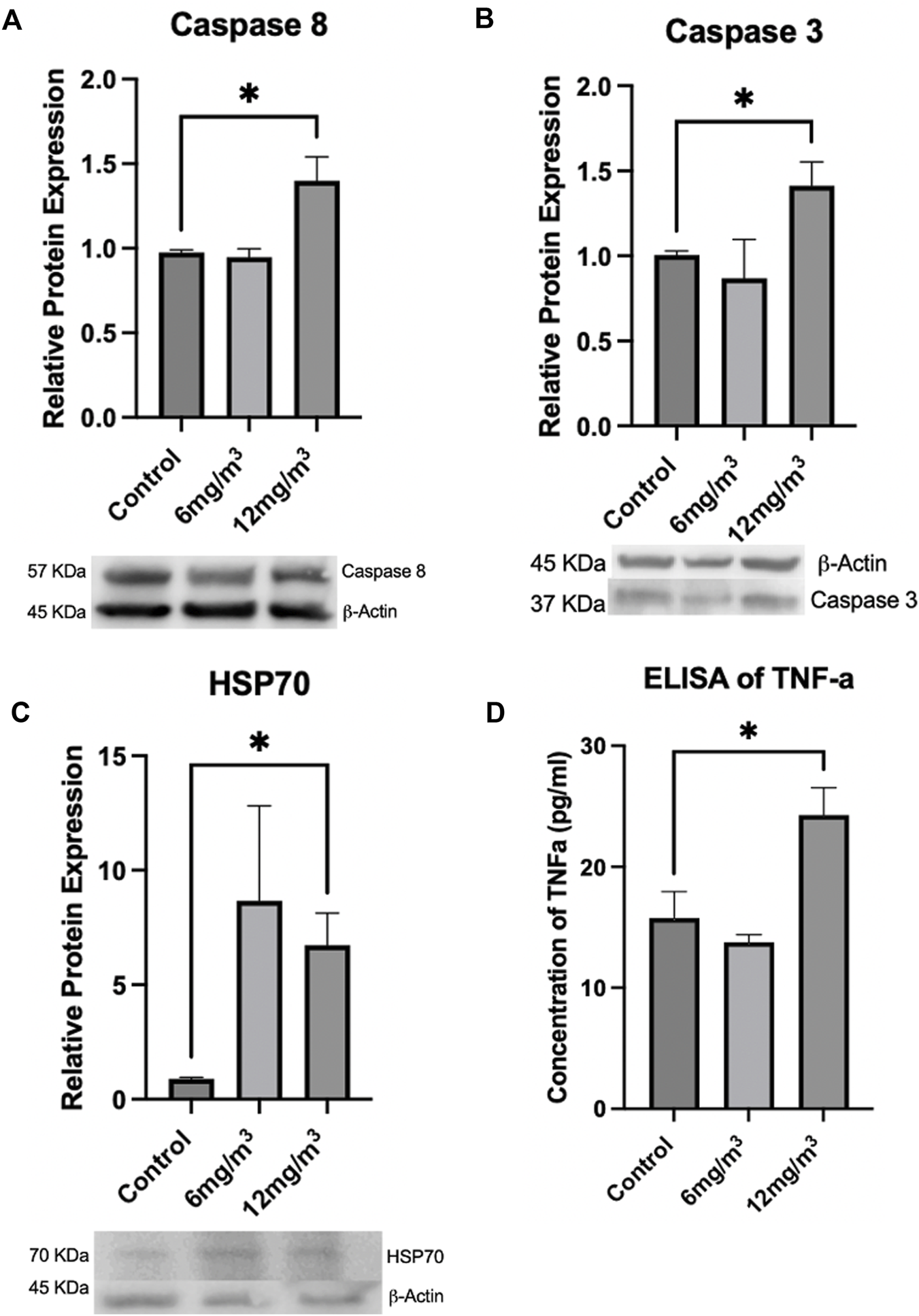 To determine if apoptosis was occurring, Caspases 8, 3, HSP70 and TNF-α were measured via Western Blot or ELISA. (A) Caspase 8 and (B) Caspase 3 were significantly increased in the 12 mg/m3 treated group when compared to vehicle control (water). (C) HSP70, a marker of cellular stress, was measured by Western Blot and was significantly increased in the high concentration group when compared to vehicle control (water). (D) An ELISA of TNF-α levels was significantly increased in the high concentration treated group when compared to vehicle control (water). For Western Blots and ELISAs n = 4.