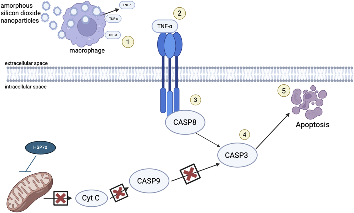 Schematic representation of the proposed mechanism of injury following exposure to SiO2 NPs. (1) After exposure to SiO2 NPs through inhalation, the NPs flow through the respiratory tract until they reach the alveoli where they are met by macrophages and neutrophils and they are phagocytized. During particle overload, and lack of mucociliary clearance, macrophages signal an inflammatory response, cytokines such as HSP70 and TNF-α are released and react, activating cell death receptors (2). TNF-α binds to death receptors transversing the cellular membrane activating procaspase 8 (3) with such recruitment leading to cleavage of caspase 3 (4) and cell death (5).