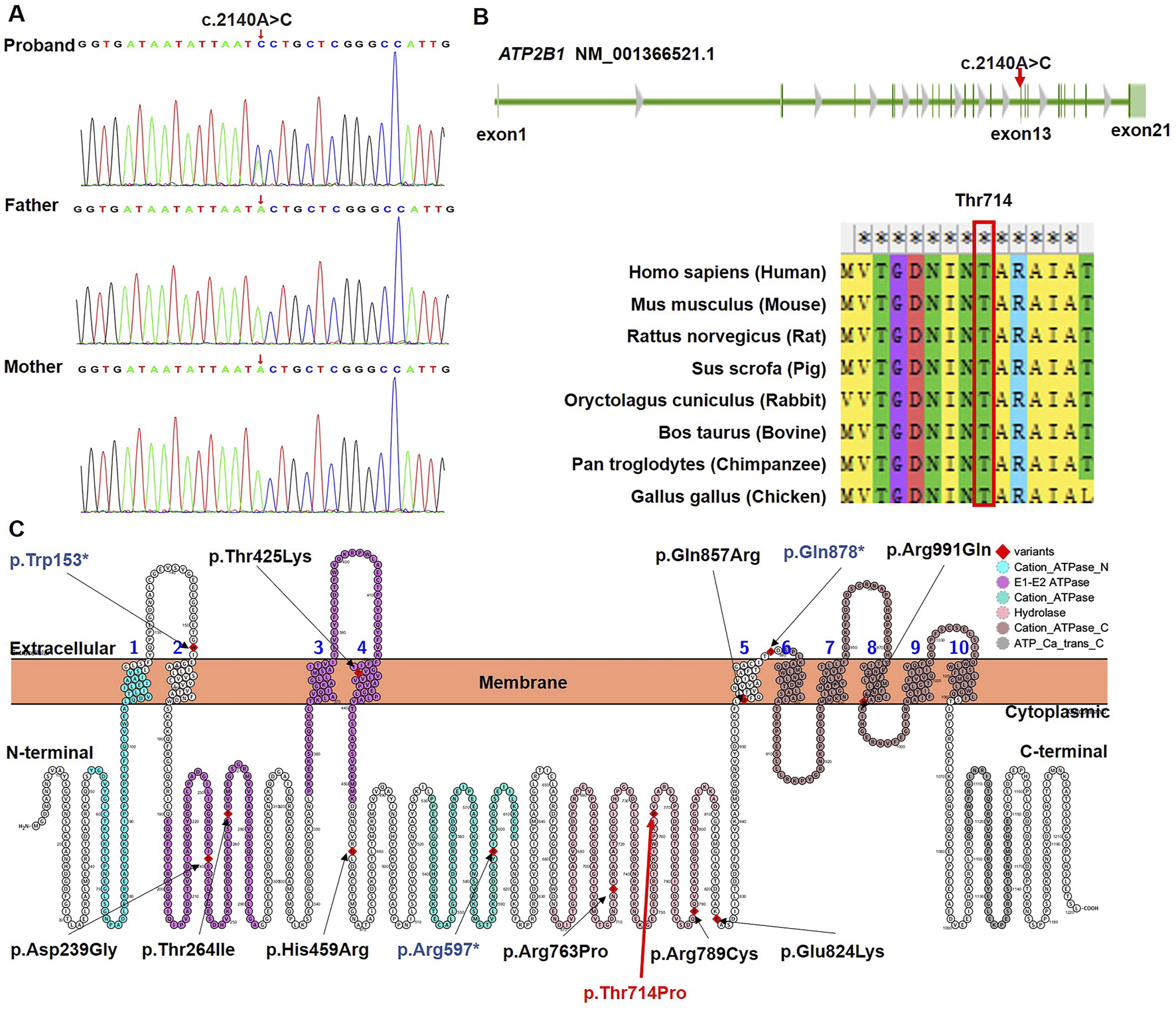 Trio-based WES identified a heterozygous missense variant in ATP2B1 (NM_001366521.1: c.2140A>C) in the proband, resulting in the substitution of proline for threonine at amino acid position 714 (p.Thr714Pro; chr12:90005077, GRCh37/hg19). Bidirectional Sanger sequencing confirmed that this variant was absent in both unaffected parents (Figure 1A; PS2) and in major population databases (gnomAD v4.1.0, dbSNP v155, 1000 Genomes Phase 3, ExAC v0.3.1; PM2_Supporting). ATP2B1 exhibits strong intolerance to missense variation, as evidenced by a high gnomAD missense Z-score (7.01; constraint threshold ≥3.09; PP2). Computational prediction tools unanimously supported a deleterious effect: Provean (−5.63), SIFT (0.0), PolyPhen-2 (1.0), MutationTaster (1), M-CAP (0.52), REVEL (0.96), CADD (27.5) (PP3). Thr714 residue is highly conserved across diverse species (Figure 1B). This variant represents a novel addition to the 12 previously reported ATP2B1 variants associated with MRD66 (Figure 1C; Table 2). No other pathogenic variants or copy-number variations explaining the proband’s phenotype were detected. Based on ACMG/AMP guidelines (PS2 + PM2_Supporting + PP2 + PP3), the ATP2B1 c.2140A>C (p.Thr714Pro) variant was classified as Likely Pathogenic.