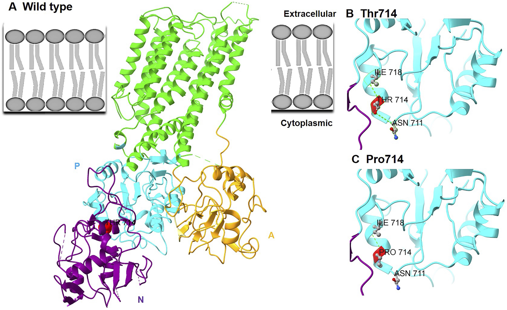 Homology modeling based on the human ATP2B1 cryo-EM structure (PDB: 6A69) positioned Thr714 within the P domain, specifically on a solvent-exposed α-helix (Figure 2A). This residue participates in essential hydrogen bonding networks that stabilize the local P-domain structure: the sidechain hydroxyl group of Thr714 forms a hydrogen bond with the backbone carbonyl oxygen of Asn711 and another with the backbone amide nitrogen of Ile718 (Figure 2B). The substitution of proline for threonine at position 714 induces significant structural perturbations: 1) Steric Incompatibility: Proline’s rigid cyclic side chain generates steric clashes (minimum atomic distance ∼1.8 Å) with the side chain of the adjacent Asn711 residue; 2) Loss of Critical Hydrogen Bonds: The absence of the hydroxyl group in proline ablates the hydrogen bonds normally formed between Thr714 and Asn711 (Figure 2C). These structural modifications destabilize the P domain interface required for calcium-dependent conformational changes during pump activation.
