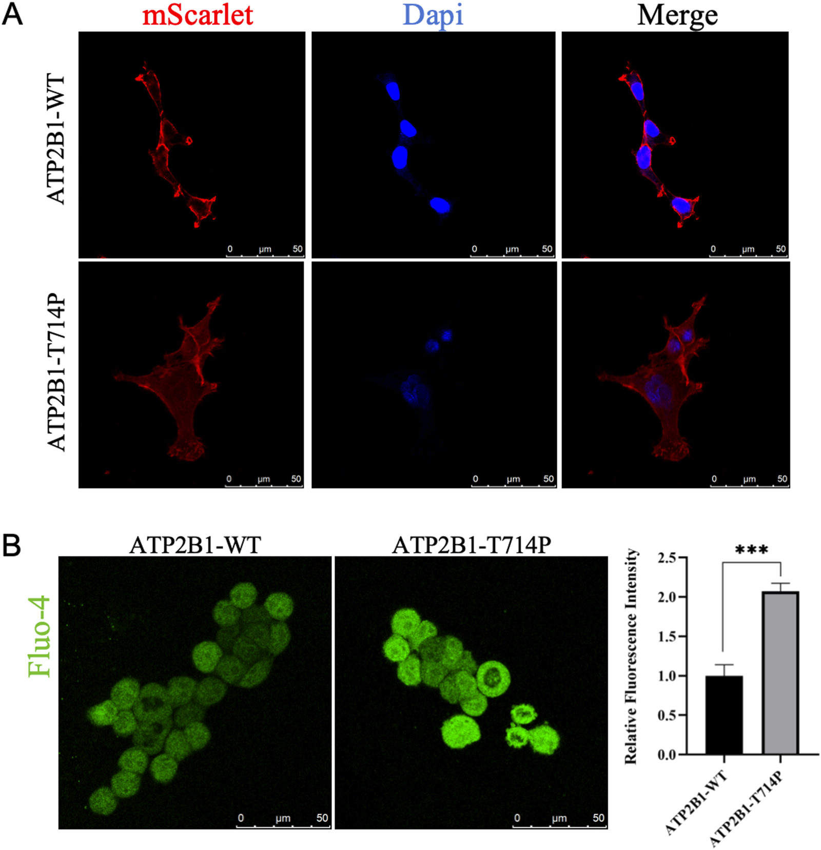 This assay was performed to assess the impact of the ATP2B1 variant on basal cytosolic calcium concentration, a key indicator of calcium homeostasis. The approach of measuring resting Ca2+ levels in transfected cells aligns with the functional validation methodology employed in prior studies of ATP2B1-related disorders [8]. Transfected HEK293T cells in 6-well plates were washed twice with pre-warmed PBS and loaded with 5 μM Fluo-4, AM (#KGE3103-1, KeyGEN BioTECH) dissolved in PBS containing 0.02% pluronic F-127 (#P3000MP, Thermo Fisher Scientific) for 30 min at 37 °C in the dark. After loading, cells were washed three times with PBS to remove excess dye and incubated in dye-free PBS for an additional 20 min at 37 °C to allow complete de-esterification of the AM ester. Cells were then gently trypsinized, resuspended in fresh PBS, and transferred to glass-bottom dishes for immediate imaging. Intracellular Ca2+ levels were quantified by measuring Fluo-4 fluorescence intensity using an Olympus IX83 fluorescence microscope equipped with a FITC filter set (excitation: 494 nm, emission: 516 nm) and a cooled CCD camera. Images were acquired using identical exposure times (200 ms) and gain settings to allow direct comparison. Baseline fluorescence intensity was measured in the absence of any stimulation for ≥100 individual cells per condition (WT, T714P, empty vector) from three independent biological replicates. To minimize photobleaching and dye leakage, cells were imaged rapidly, and exposure time was strictly limited. Fluorescence intensity values were background-subtracted using cell-free regions. Mean fluorescence intensity per cell was calculated.