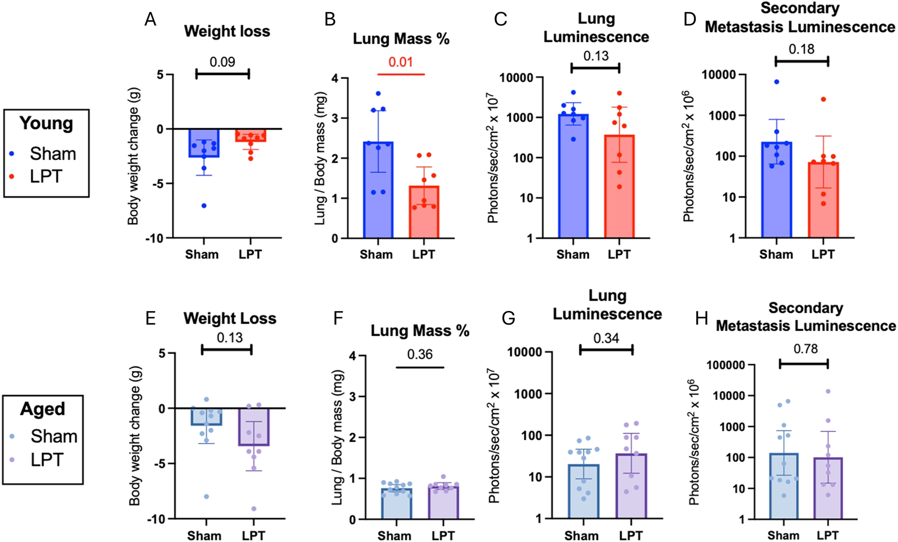 The impact of LPT on metastatic disease was assessed using four markers of tumor burden in old and young adult mice: weight loss, lung mass percent, lung luminescence, and secondary organ luminescence (Figure 2). LPT did not significantly increase tumor burden in young adult or old mice. Lung mass percent is a normalized measure of lung weight and a historical gross measure of tumor burden. In young animals that received LPT before and after the IV injection of cancer cells, lung mass percentage decreased significantly (p = 0.01). The luminescence from luciferase activity in cancer cells was quantified as a specific measure of tumor burden. LPT did not statistically affect luminescence in the lungs or organs outside of the lungs. Although this was true for both age groups, a trend of decreased luminescence in the lungs and secondary organs was observed in the younger animals that received LPT, with p-values of 0.13 and 0.18, respectively. LPT did not significantly affect weight loss in young adult or aged mice.