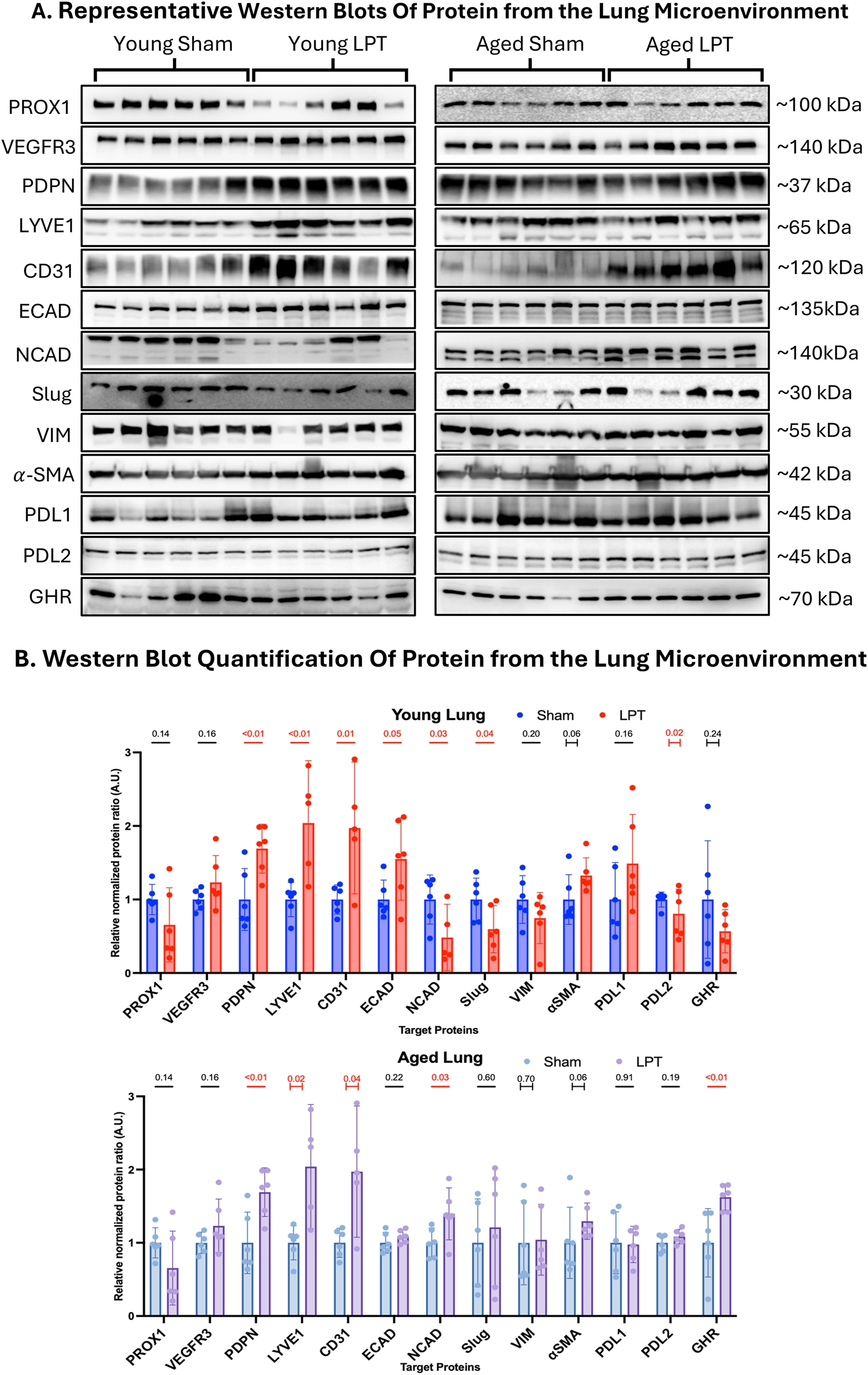 The following proteins of interest (Figure 3) were selected to investigate three physiological events linked to (1) lymphangiogenesis (PROX1, VEGFR3, PDPN, LYVE1, CD31), (2) endothelial-to-mesenchymal transition (ECAD, NCAD, Slug, VIM, -SMA, and (3) immune modulation (PDL1, PDL2, GHR). The most robust overlapping effect of LPT across the two ages was its impact on markers of lymphatic vessels. LPT nearly doubled the expression of CD31 (p = 0.01 and p = 0.04), LYVE1 (p < 0.01 and p = 0.02), and PDPN (p < 0.01 and p < 0.01) in both young adult and aged mice, respectively. The effect of LPT on markers of epithelial-to-mesenchymal transition was more pronounced in young animals. LPT increased the expression of the epithelial marker ECAD (p = 0.05) and decreased the expression of the pro-metastatic marker NCAD (p = 0.03) and Slug (p = 0.04) in the young animals. Only the pro-metastatic marker NCAD (p = 0.03) significantly changed in the aged animals after LPT treatment. Regarding immune modulation, LPT significantly decreased PDL2 expression (p = 0.02) in young adult mice and increased GHR expression (p < 0.01) in old mice.