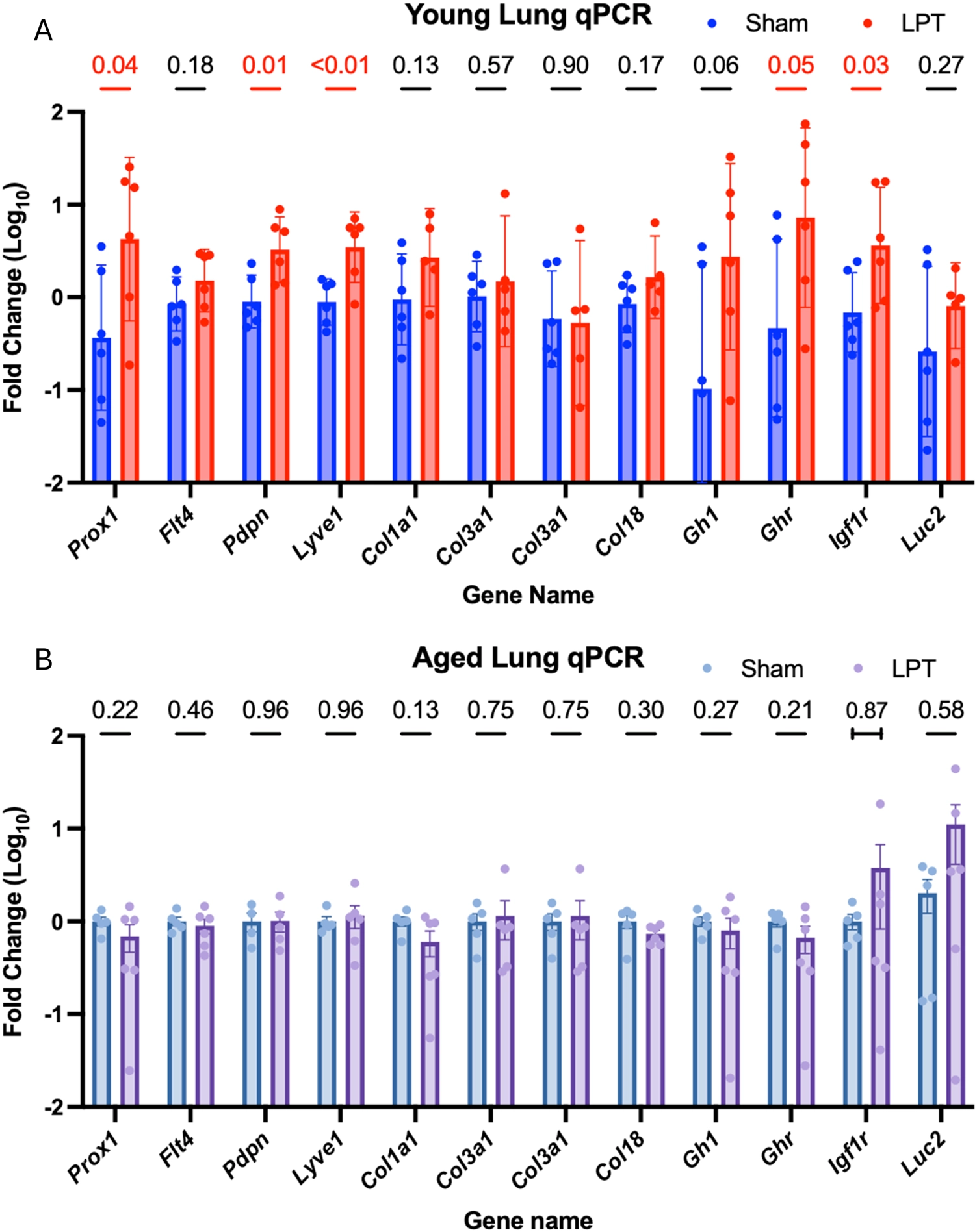 Using qPCR to measure gene expression changes at the RNA level (Figure 4), we found that young adult animals receiving LPT had increased expression of the lymphangiogenesis-related RNA transcripts like Lyve1, Flt4 (podoplanin), and Prox1 compared to the sham treatment (p < 0.01, p < 0.01, p = 0.04, respectively). However, this effect was not observed in the aged group. Similarly, in the young cohort, there was an increased expression of Ghr (p = 0.05) and Igf1r (p = 0.03), but no significant change was observed in the aged cohort.