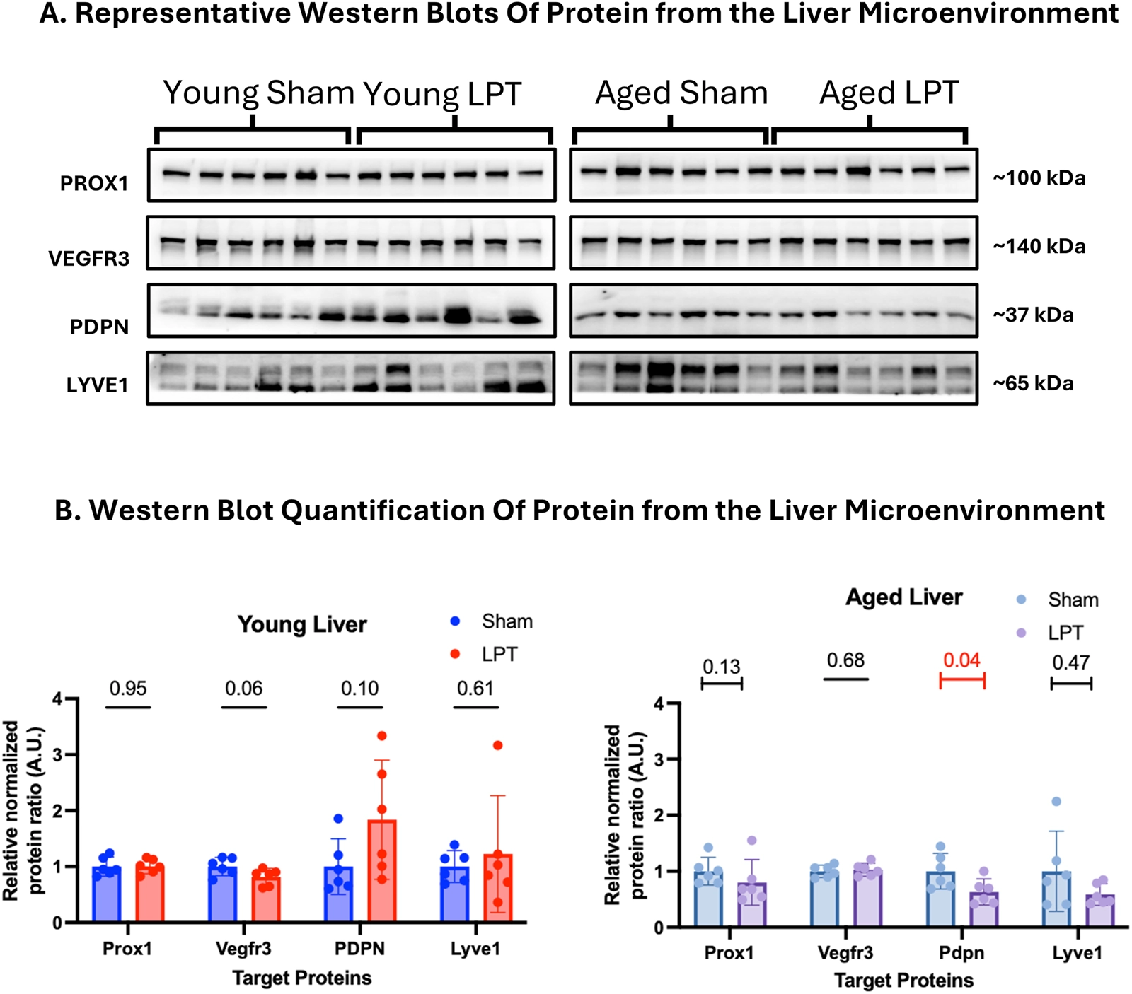 As with the lungs, liver protein samples were analyzed by western blot for expression of markers of the lymphatic system (Figure 5). LPT appeared to have little effect on the expression of LEC markers in both young and old animals. The only significant change caused by LPT was decreased PDPN expression in aged animals (p = 0.04).
