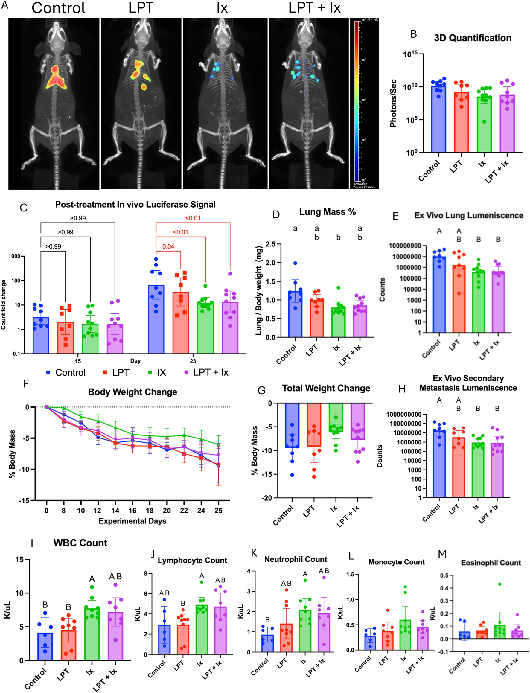 To control for variability in tumor cells injected intravenously, two-dimensional whole-body luminescence was measured on day 7, the day before treatment started, and again on days 15 and 23 after treatment started. The pre-treatment signal on day 7 was used to normalize the post-treatment signals on days 15 and 23 for the individual mouse. Compared to the control, the LPT group (p = 0.04), the Ix group (p < 0.01), and the LPT + Ix group (p < 0.01) all had significantly reduced in vivo luminescence on day 23. On day 25, ex vivo measures of tumor burden, including lung mass percentage, ex vivo lung luminescence, and ex vivo secondary organ luminescence, were collected, resulting in a bimodal distribution of tumor burden between mice treated with immunotherapy and those that were not. LPT did not interfere with the efficacy of immunotherapy in any of the measures.