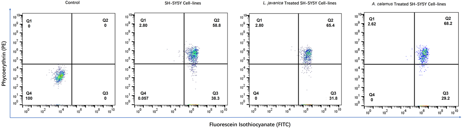 Mitochondrial function in SH-SY5Y neuroblastoma cells was evaluated using flow cytometry and the JC-1 fluorescent probe to quantify variations in membrane potential (ΔΨm). As illustrated in Figure 2, in terms of untreated SH-SY5Y control cells, 58.8% of the population was within the Q2 gate, signifying cells with high ΔΨm (red fluorescence), although 38.3% of the population was situated in the Q3 gate, conforming to mitochondrial depolarization (green fluorescence). Following plant extract treatment, the proportion of the cells with high ΔΨm increased to 68.2% for A. calamus and 65.4% for L. javanica, implying increased mitochondrial polarization comparative to untreated controls.