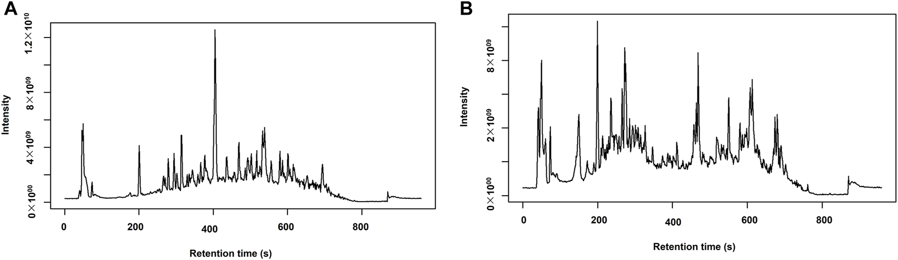 The chromatogram of A. calamus with the dominating of a particularly intense peak at ∼400 s, with a highest intensity of ∼1.2 × 1010. Subsequent moderate peaks were detected at ∼700, ∼550, ∼200, and ∼50 s. Conversely, L. javanica offered an evenly dispersed chromatographic profile with multiple peaks of medium to high intensity detected between 100s and 600s. The most intense peak occurred at ∼220 s (∼4.0 × 109). Additional prominent peaks were detected at ∼720, ∼600, ∼400, and ∼100 s.