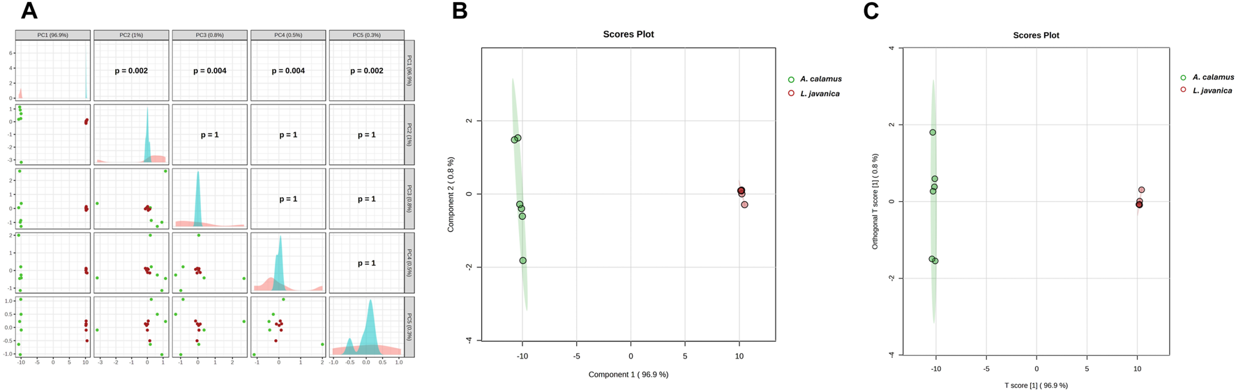 Principal Component Analysis (PCA) score model of the associated features displays complete species segregation across PC1, with a variance of 96.9% (PC2 = 1.0%). The PCA pair-plot validates that cluster variances are concentrated on the first component and also noticeable, but smaller on higher components. The dispersals of scores vary significantly for PC2: p = 0.002, PC3: p = 0.004, PC4: p = 0.004, and PC5: p = 0.002 (Figure 4A). These results signify the possession of distinct global metabolomic fingerprints of the two species, dominated by variance expressed on PC1. The observed clustering patterns were statistically significantly validated using the PERMANOVA test, consisting of an F-value of 936.71, a p-value = 0.005, and R2 = 0.98944.