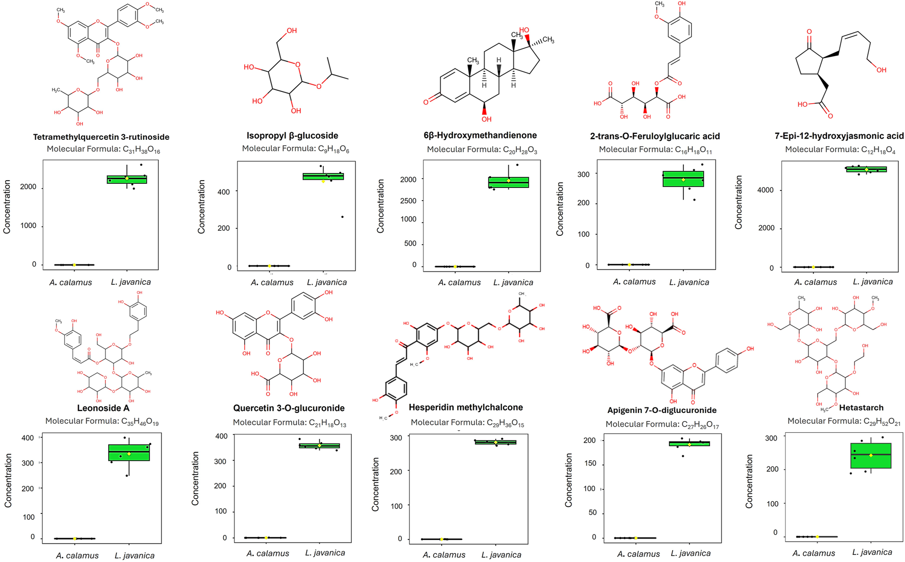 Univariate analysis recognized the top ten metabolites with VIP >2.0, FC >2.0, p < 0.05 and FDR-adjusted p < 0.05 that significantly differentiated the clusters of A. calamus and L. javanica (Table 1). Figure 5 depicts major significant metabolites comprising Tetramethylquercetin 3-rutinoside, Isopropyl β-glucoside, and 6β-Hydroxymethandienone, altogether presenting an extreme fold of enrichment. Further significant metabolites comprised of 2-trans-O-Feruloylglucaric acid, 7-Epi-12-hydroxyjasmonic acid, and Leonoside A. Flavonoid derivatives, for instance Quercetin 3-O-glucuronide, Hesperidin methylchalcone, and Apigenin 7-O-diglucuronide were also significantly differentiated. Additionally, Hetastarch also provided a contribution to the metabolic variance. Together, these compounds underscore jasmonates, flavonoid glycosides, and phenolic derivatives as crucial, statistically significant metabolites, supporting the distinct chemical divergence amongst the two plant species. These compounds show higher abundances constantly in L. javanica (Figure 5). A detailed chemical profiling of each compound is represented in the Supplementary Table S1.