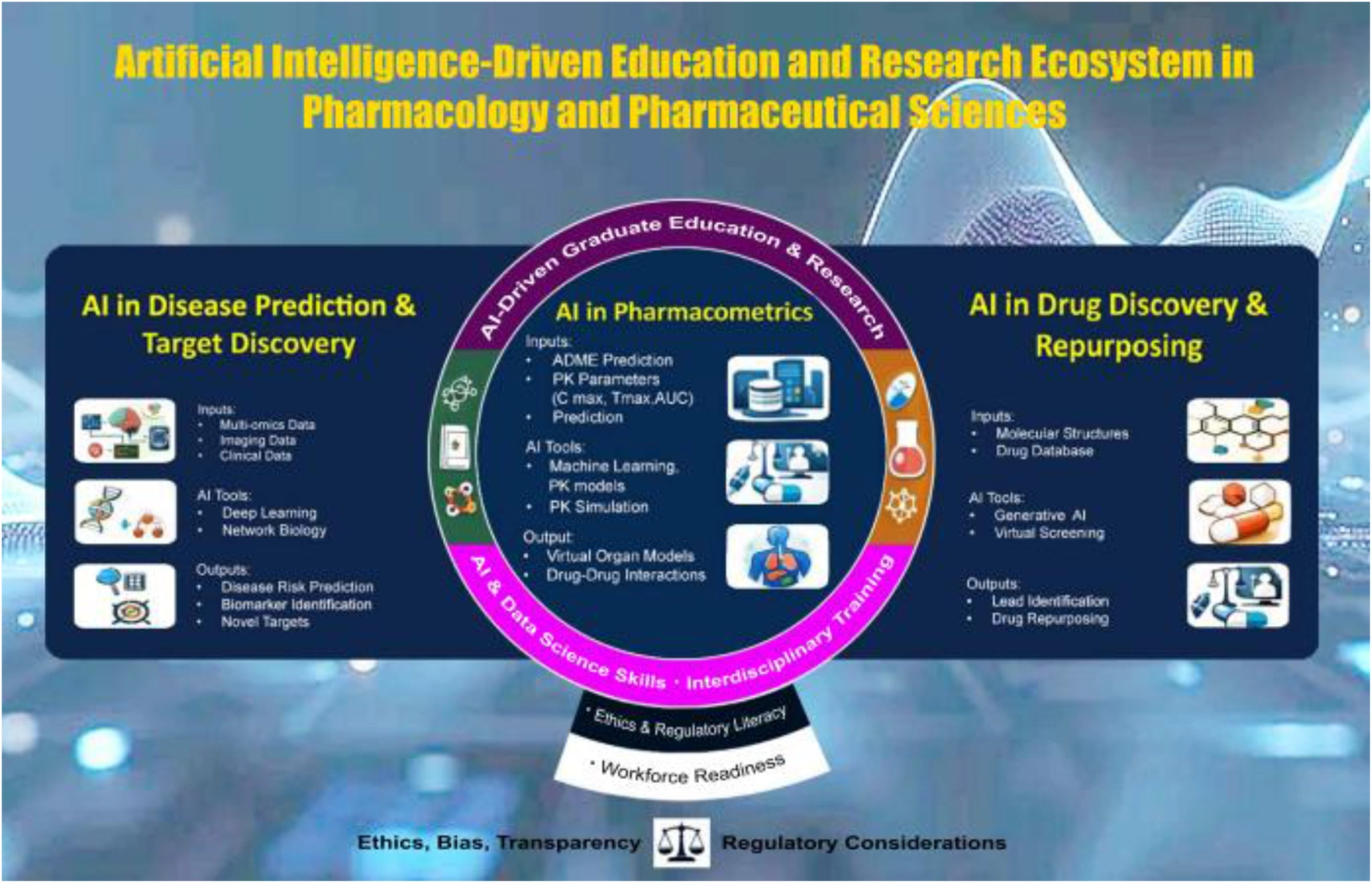 There are several universities in the United States that offer graduate certificate or master’s level training in AI and ML and their potential use in pharmacology, pharmaceutical, biomedical, or biological sciences (Table 1). The existing programs vary in scope and emphasis. Although these certificate and MS programs are great initiatives in the right direction at the right time, more universities and institutions should take the challenge of integrating AI into pharmaceutical and biomedical sciences [3]. Since covering all dimensions of AI/ML-powered biomedical or health sciences is beyond the scope of this review, we discuss three major areas of pharmacology and pharmaceutical sciences in which graduate education and research may be focused to prepare our next-generation of educators and researchers (Figure 1). 1) AI in Disease Prediction and Target Discovery, which explores the transformative role of AI in predicting the progression of human diseases, understanding underlying molecular mechanisms, and identifying viable drug targets, 2) AI in Drug Discovery and Repurposing, focusing on rapidly evolving applications of AI across drug discovery and drug repurposing, and 3) AI in Pharmacometrics, which explores how AI and ML transform pharmacometrics, including pharmacokinetic/pharmacodynamic (PK/PD) modeling, dose optimization, and clinical trial simulation. These educational and research programs may also be expanded to address regulatory and ethical considerations, as well as current limitations of AI in these areas (Figure 1).